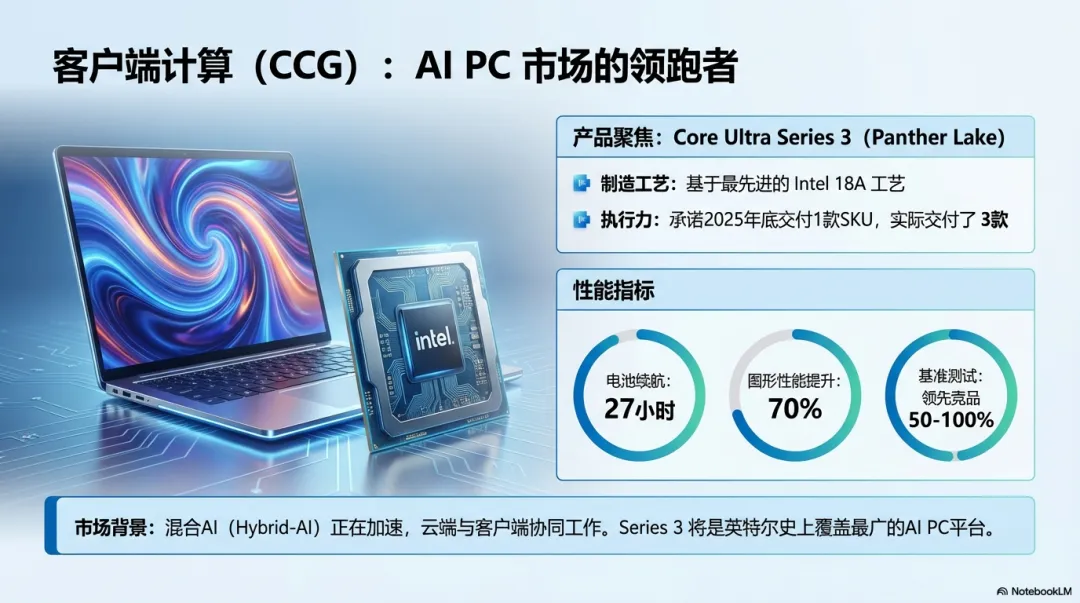 新一代酷睿 Ultra 3(代号 Panther Lake / 黑豹湖),基于 Intel 18A 工艺;并提出“混合式 AI”作为 AIPC 的核心愿景。