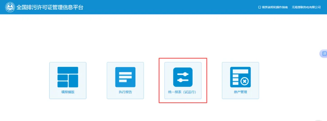 填报方式:登录全国排污许可证管理信息平台—企业端,先点击“执行报告”按钮(图2),再点击“统一报表”按钮(图3),无需填报排污许可证执行报告年报。填报统一报表时,相关信息严格按照实际情况填写,并与排放源统计年报填报的信息保持一致