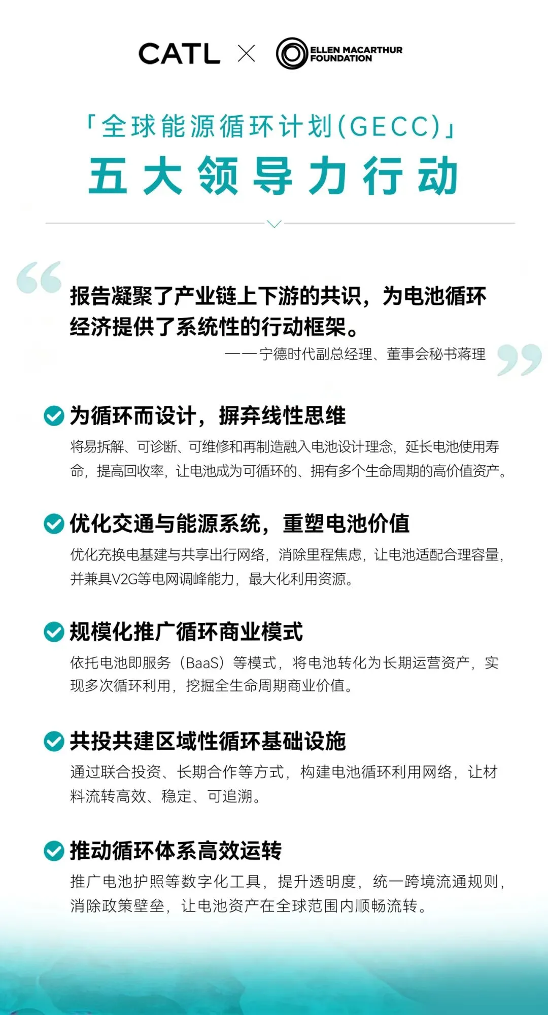宁德时代副总经理、董事会秘书蒋理表示,公司已率先践行五大领导力行动,打造了完整的循环闭环体系,贯穿电池研发、材料使用、商业应用、回收和再利用的全生命周期。