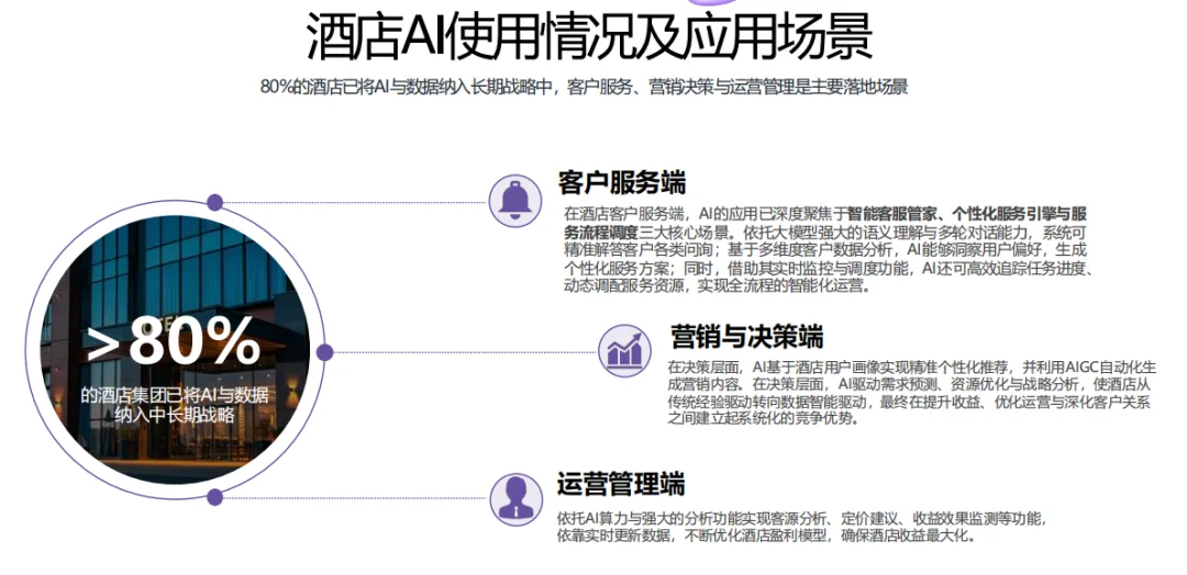 报告显示,80%的酒店集团已将AI与数据纳入中长期战略。客户服务、营销决策与运营管理是三大主要落地场景。