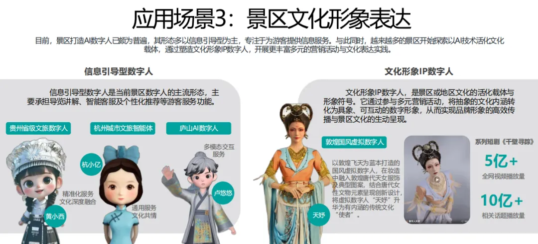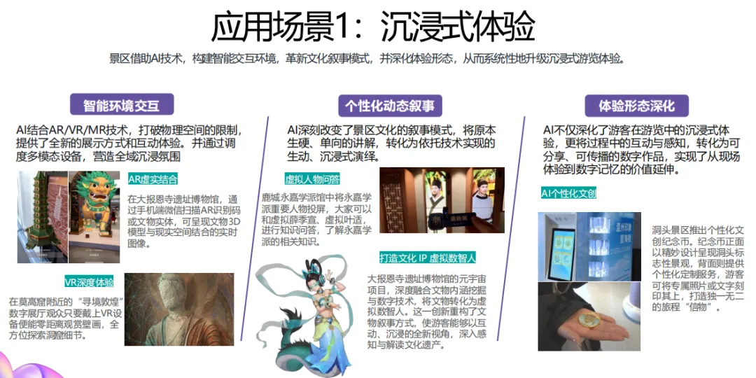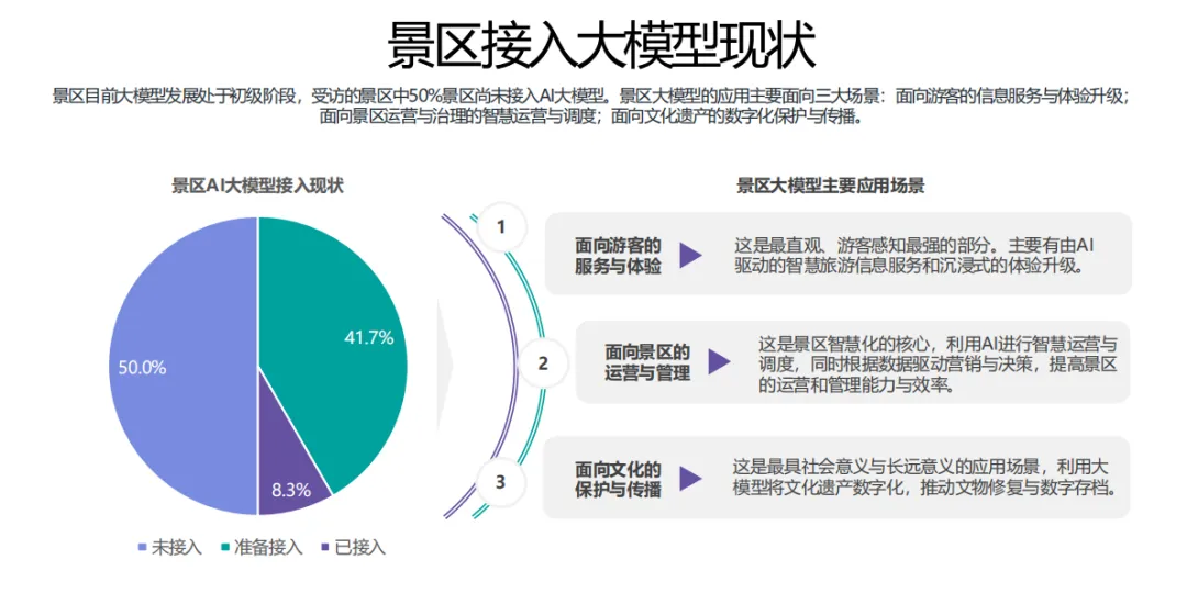 在景区方面,AI应用主要面向三大场景:游客信息服务与体验升级、景区智慧运营与调度、文化遗产数字化保护与传播。