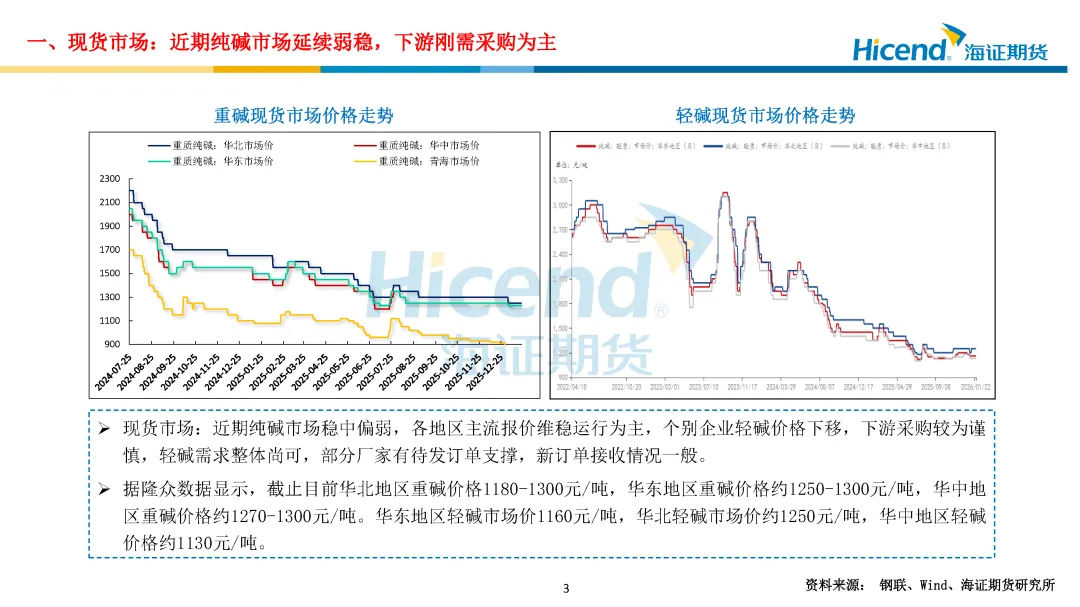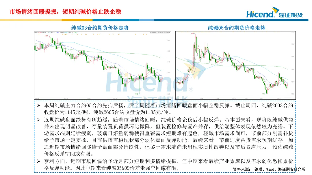 本周纯碱主力合约05合约先抑后扬,后半周随着市场情绪回暖盘面小幅企稳反弹。截止周四,纯碱2603合约收盘价为1145元/吨,纯碱2605合约收盘价为1185元/吨。