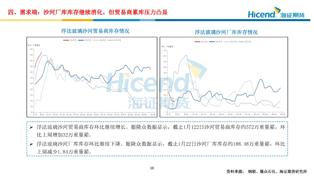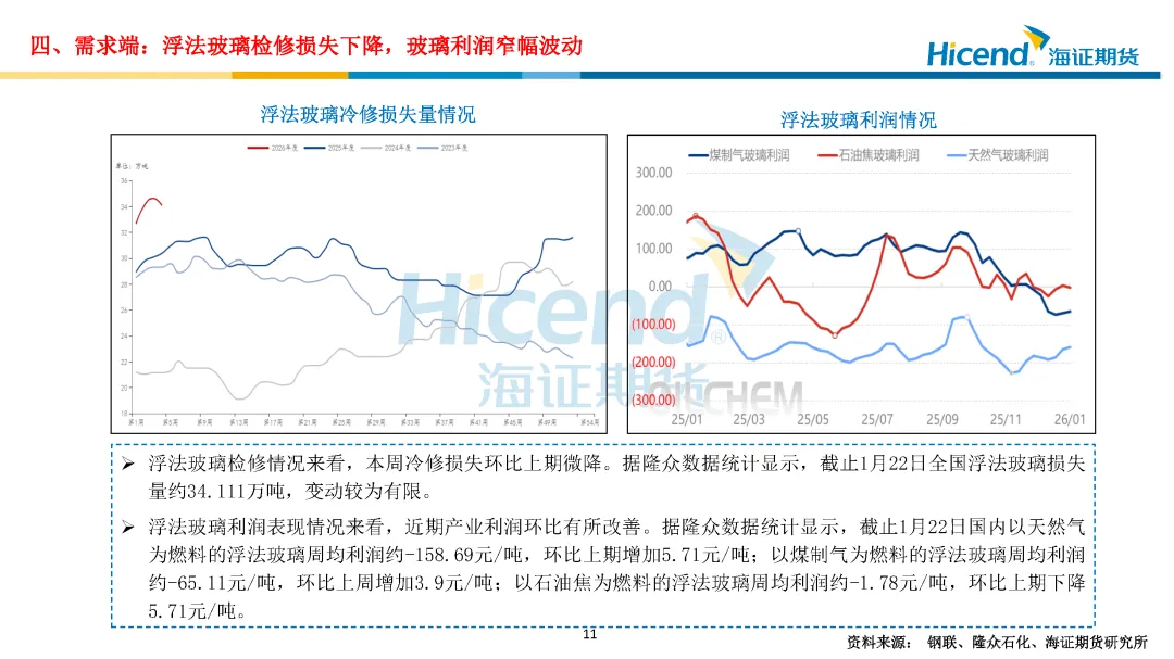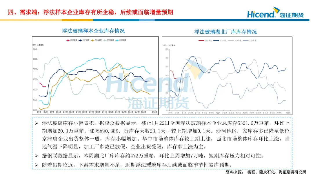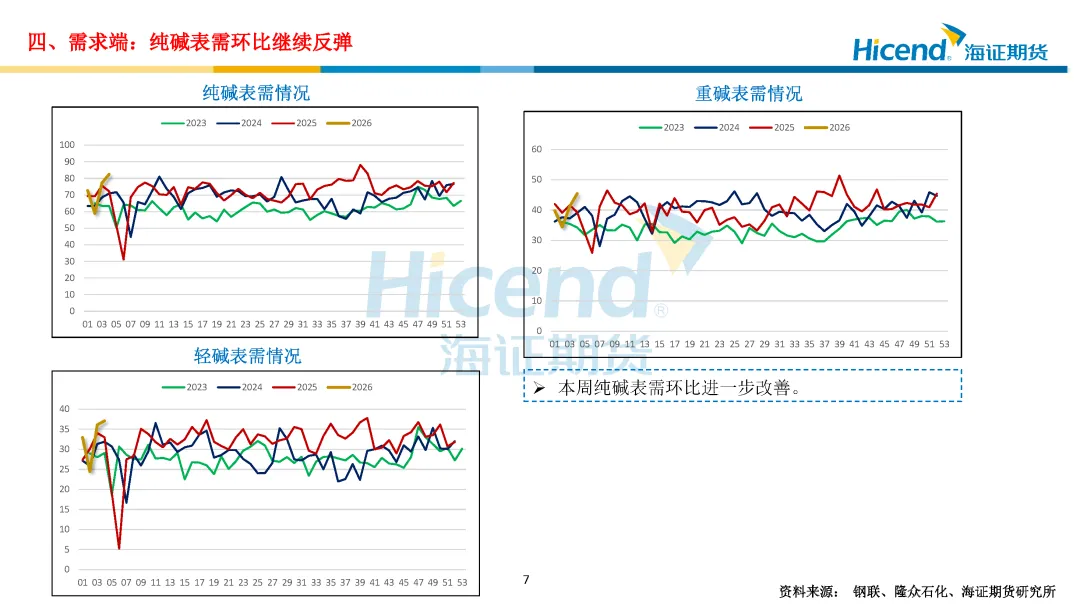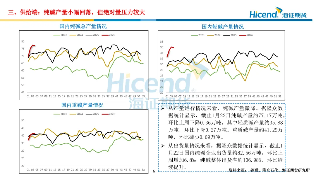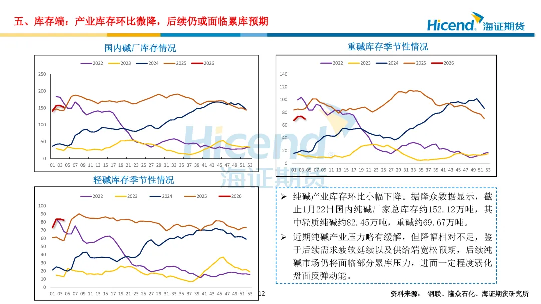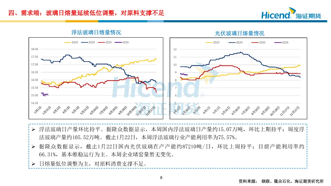 近期纯碱盘面跌势有所趋缓,随着市场情绪回暖,纯碱价格企稳后小幅反弹。基本面来看,现阶段纯碱供需并未出现明显改善,存量装置负荷虽环比微降,但装置检修与复产并存,供给端整体表现依然较为充裕。下游需求端则延续疲弱,玻璃日熔量弱稳使得重碱需求短期难有起色,轻碱市场需求尚可,节前部分刚需补货给予市场一定支撑,目前供增需稳现状部分弱化盘面反弹动能。后续来看,节前适度备货需求预期犹存,加之近期市场情绪回暖给予盘面部分抗跌性,但鉴于需求端尚未出现实质性改善以及节后累库压力,预估纯碱价格反弹空间或有限。