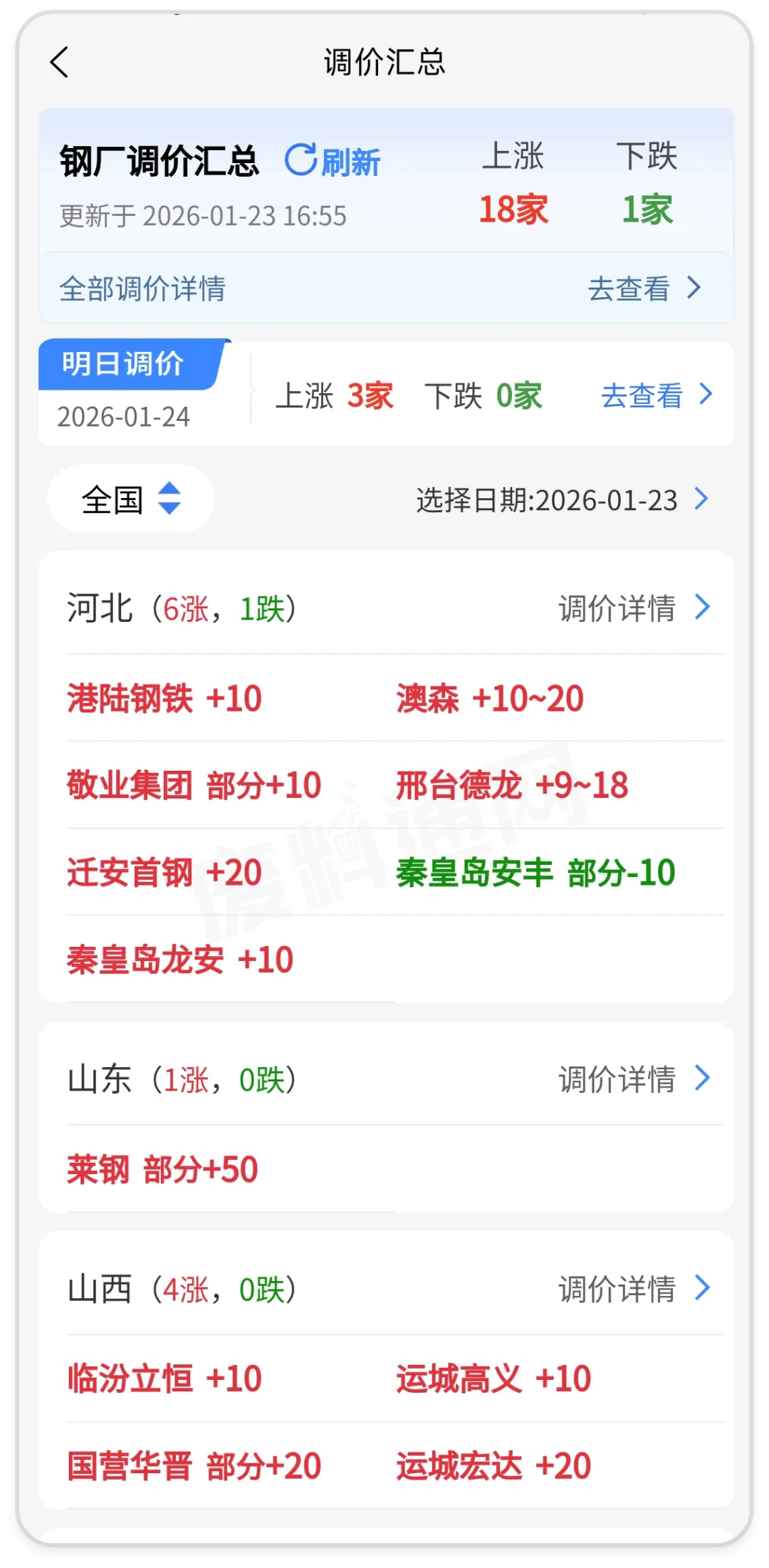 1月24日,江苏【永钢】门市废钢价格上调30元/吨,最新执行价:纯净废钢一2610,冲压料一2510,钢筋切头2550,电工钢一2395,重一2570,重二2530,重三2500,炉一2420,中一2280,小一2200,含税