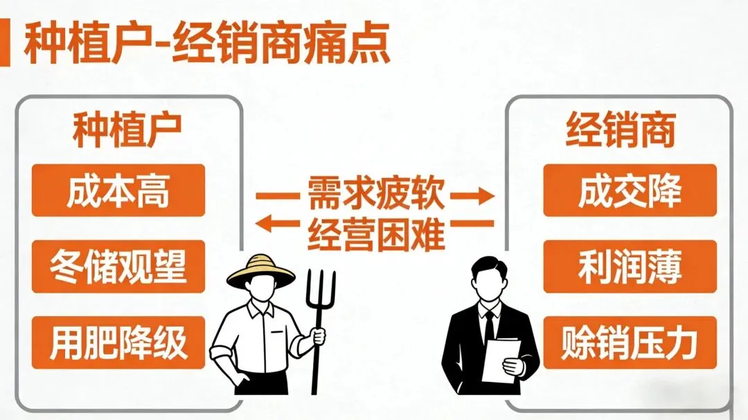 2. 下游需求疲软:冬储意愿偏低,种植户采购谨慎,经销商不敢大量囤货,市场成交以小单刚需为主,缺乏大规模采购支撑。