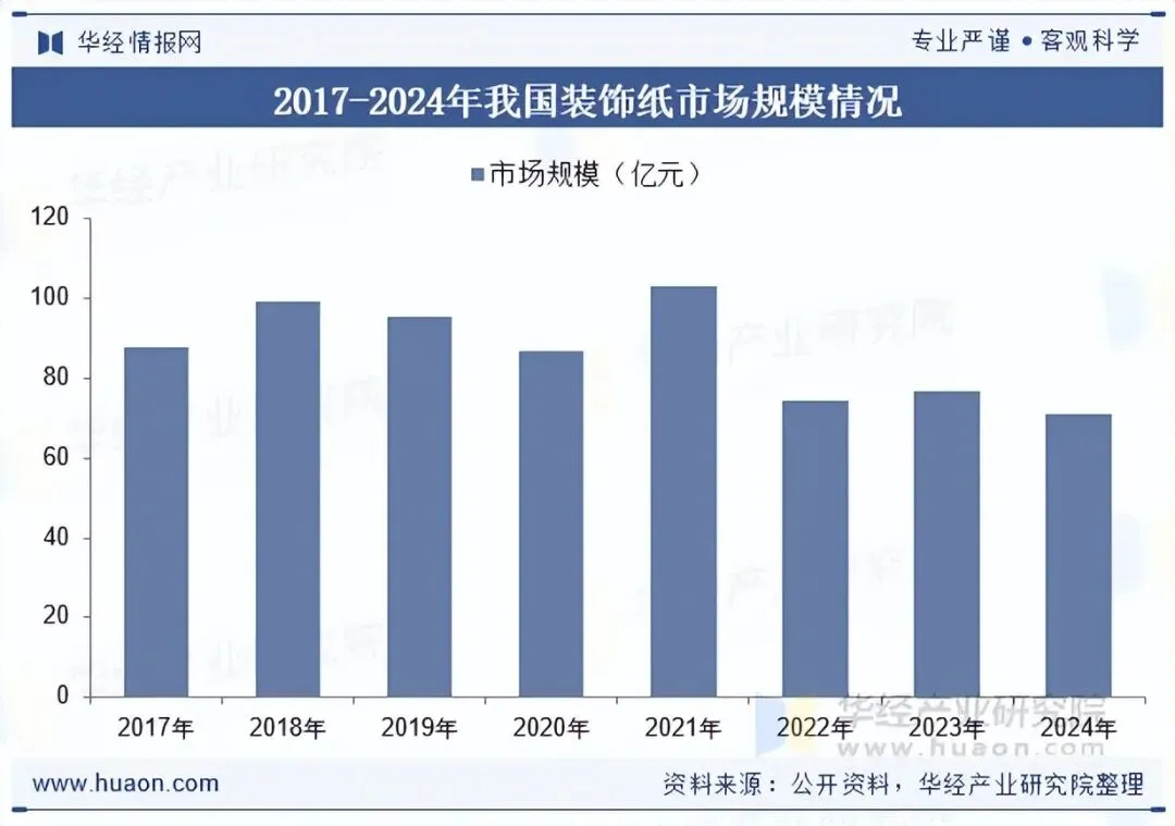 装饰纸是原纸印刷后贴在人造板表面,然后喷涂涂料;或原纸印刷后,浸渍树脂并干燥制成腔膜纸,在高温条件下压贴在板材表面上,对人造板起装饰和保护作用。装饰纸最初主要应用于家装领域,如地板、木门、墙板、衣柜、橱柜等,后来逐渐拓展到室外装修、广告、飞机、高铁、医院、实验室等公共场所。到现在,装饰纸已成为天然薄木的最佳代替品,还逐步替代天然石材、皮革、布艺、PVC等一系列其他装饰材料,据统计2024年我国装饰纸整体规模约为71.3亿元。