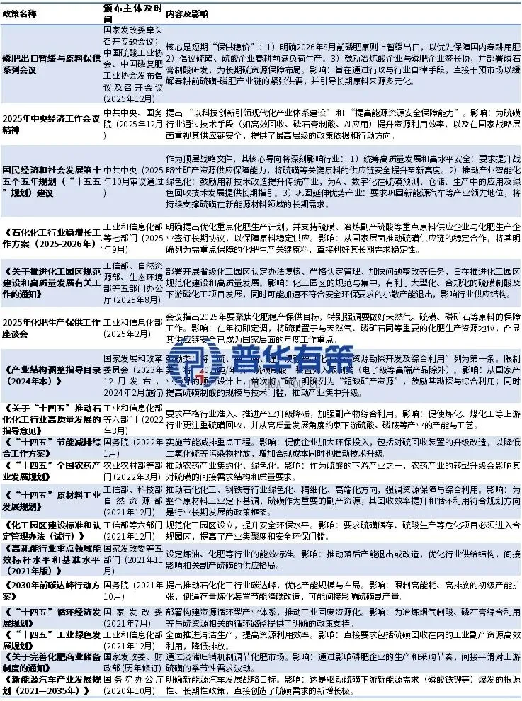 “十四五”以来,政策主线聚焦供应链安全与绿色低碳转型。“十五五”规划建议前瞻性强调提升战略资源供应链韧性。2025年中央经济工作会议要求“以科技创新引领现代化产业体系建设”、“提高能源资源安全保障能力”,为硫磺行业指明了技术升级和保障供应稳定的行动方向。具体政策围绕产业升级、环保约束及市场调控展开。