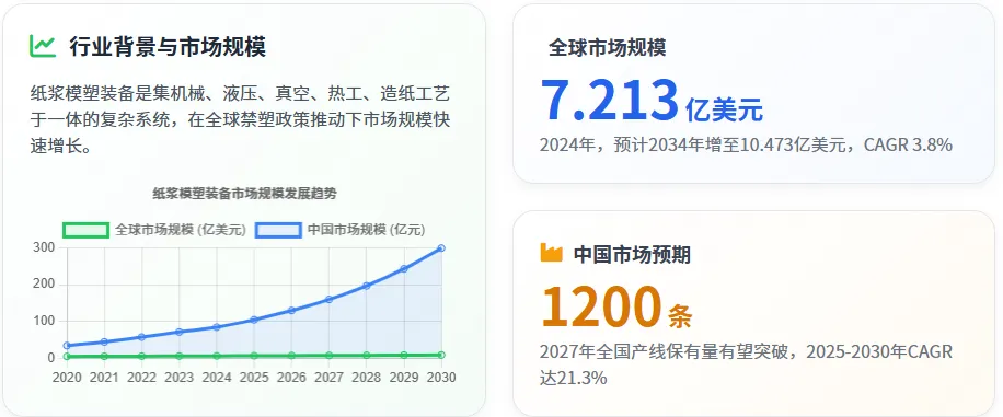 纸浆模塑作为环保包装的重要组成部分,近年来在全球禁塑政策推动下迎来爆发式增长。2024 年全球纸浆模塑设备市场规模达到 7.213 亿美元,预计 2034 年将增至 10.473 亿美元,年复合增长率达 3.8%。中国作为全球最大的纸浆模塑生产与消费国,2023 年市场规模约 85 亿元,2025-2030 年预计年复合增长率达 21.3%,2027 年全国产线保有量有望突破 1200 条。