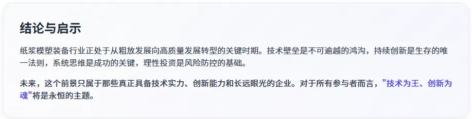 通过对某龙和某龙头企业两个典型案例的深入剖析,以及对纸浆模塑装备技术壁垒的系统分析,我们可以得出以下核心结论: