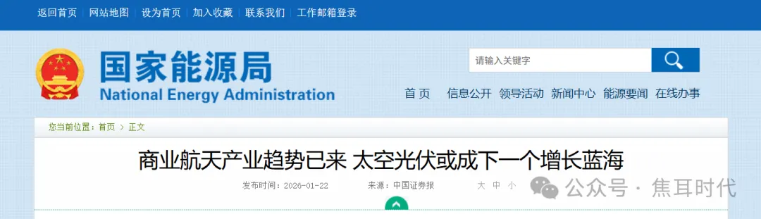 1月22日,国家能源局官网转发了这篇来自于《中国证券报》的文章——商业航天产业趋势已来 太空光伏或成下一个增长蓝海,后来仅过了一天就删除了,具体原因不清楚。