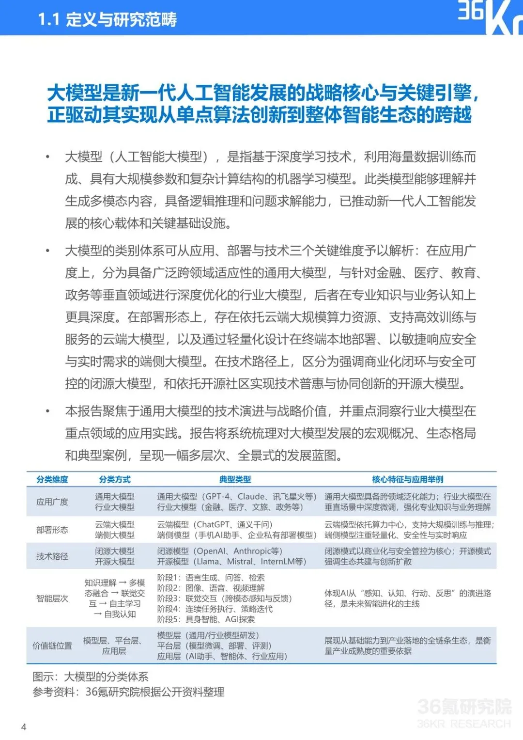 报告由 36 氪研究院发布,聚焦中国大模型行业发展现状与趋势。大模型已成为科技创新与产业安全的战略支点,政策形成 “创新驱动、基础强化、场景牵引、安全治理” 四位一体格局。行业呈现 CBDG(消费者、企业、设备、政府)四维生态新范式,竞争从单点技术对决转向体系化较量,技术向多模态、智能体、具身智能演进,商业化逐步进入规模化阶段。