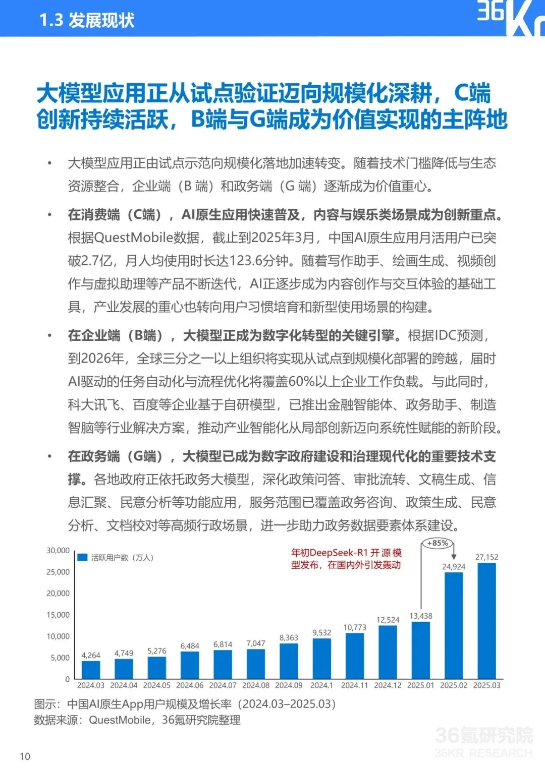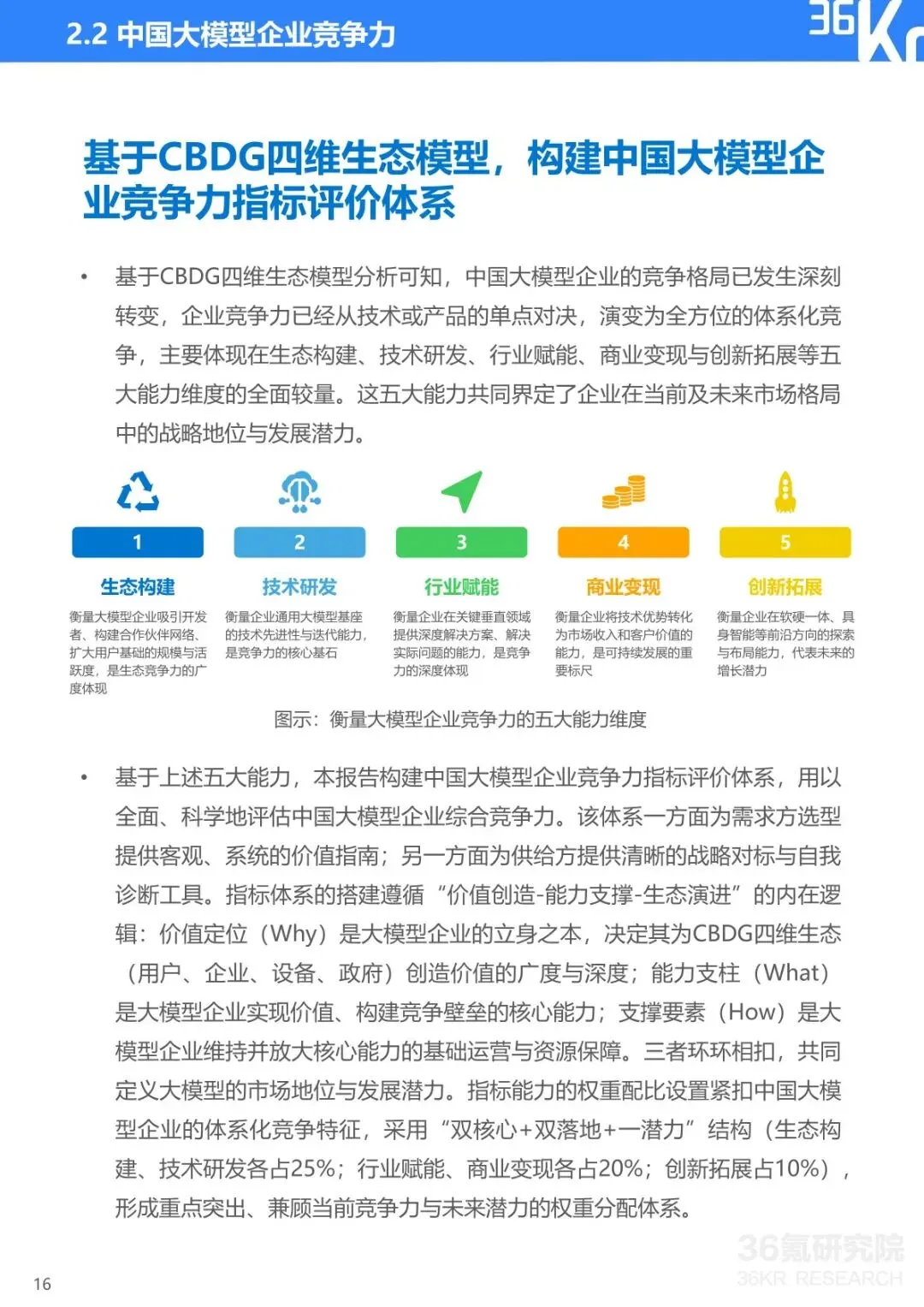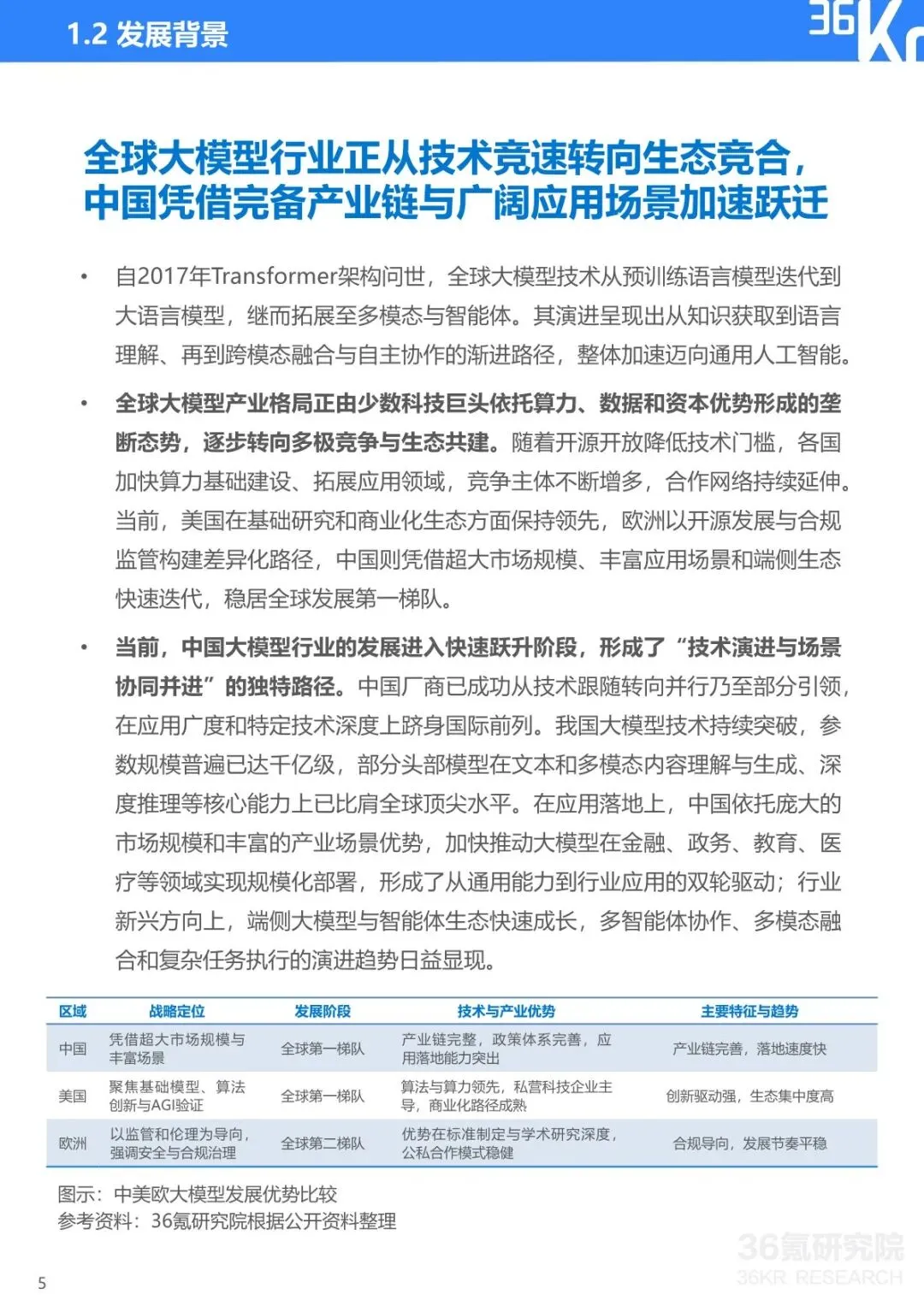 报告由 36 氪研究院发布,聚焦中国大模型行业发展现状与趋势。大模型已成为科技创新与产业安全的战略支点,政策形成 “创新驱动、基础强化、场景牵引、安全治理” 四位一体格局。行业呈现 CBDG(消费者、企业、设备、政府)四维生态新范式,竞争从单点技术对决转向体系化较量,技术向多模态、智能体、具身智能演进,商业化逐步进入规模化阶段。