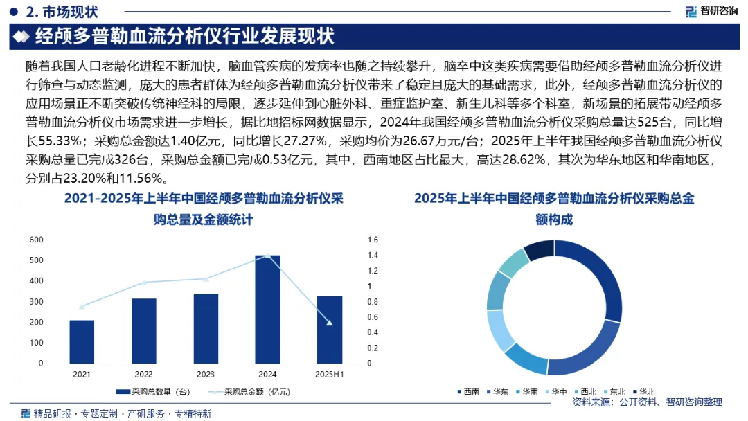 经颅多普勒血流分析仪利用超声多普勒效应,以颅骨较薄部位和自然骨孔(如颞骨、枕骨大孔、眼眶等)作为检测声窗,对颅内动脉血流动力学进行评估,是神经内科、神经外科、功能检查科、体检科等科室的重要无创诊断工具,被称为「脑部听诊器」。据比地招标网数据显示,2024年我国经颅多普勒血流分析仪采购总量达525台,同比增长55.33%;采购总金额达1.40亿元,同比增长27.27%,采购均价为26.67万元/台;2025年上半年我国经颅多普勒血流分析仪采购总量已完成326台,采购总金额已完成0.53亿元,其中,西南地区占比最大,高达28.62%,其次为华东地区和华南地区,分别占23.20%和11.56%。
