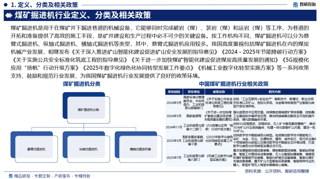 产业链核心节点:煤矿掘进机行业上游主要包括钢材、铜材、铝材、橡胶等原材料供应商以及截割电机、液压系统、控制系统、截割头等核心零部件供应商;行业中游为煤矿掘进机研发、生产、制造等环节;行业下游为应用市场,煤矿掘进机主要面向煤矿开采业,煤矿掘进机能够快速、高效地掘进,并且可以保证巷道的成型质量。此外,近年来,煤矿掘进机应用场景正从传统煤矿开采向多元化延伸,页岩气开采、金属矿山等领域对定制化掘进机需求增长,应急救援领域因逃生通道建设标准落地,也催生了稳定的设备采购需求。