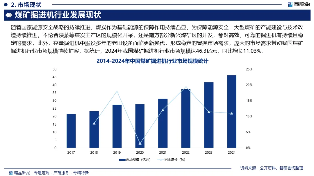 煤矿掘进机是用于在煤矿井下掘进巷道的机械设备,它能够同时完成破岩(煤)、装岩(煤)和运岩(煤)等工序,为巷道的开拓和准备提供了高效的施工手段,是矿井建设和生产过程中必不可少的关键设备。随着国家能源安全战略的持续推进,煤炭作为基础能源的保障作用持续凸显,为保障能源安全,大型煤矿的产能建设与技术改造持续推进,不论晋陕蒙等煤炭主产区的规模化开采,还是南方部分新兴煤矿区的开发,都对高效、可靠的掘进机有持续且稳定的需求。此外,存量掘进机中服役多年的老旧设备面临更新换代,形成稳定的置换市场需求,庞大的市场需求带动我国煤矿掘进机行业市场规模持续扩容,据统计,2024年我国煤矿掘进机行业市场规模达46.3亿元,同比增长11.03%。