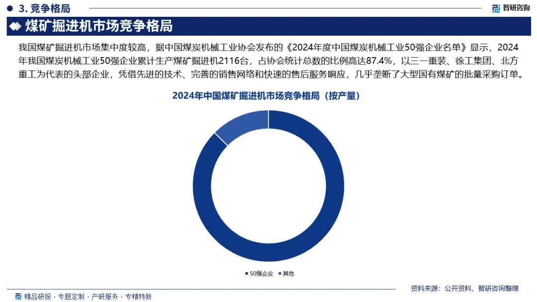 市场竞争格局:我国煤矿掘进机市场集中度较高,据中国煤炭机械工业协会发布的《2024年度中国煤炭机械工业50强企业名单》显示,2024年我国煤炭机械工业50强企业累计生产煤矿掘进机2116台,占协会统计总数的比例高达87.4%,以三一重装、徐工集团、北方重工为代表的头部企业,凭借先进的技术、完善的销售网络和快速的售后服务响应,几乎垄断了大型国有煤矿的批量采购订单。