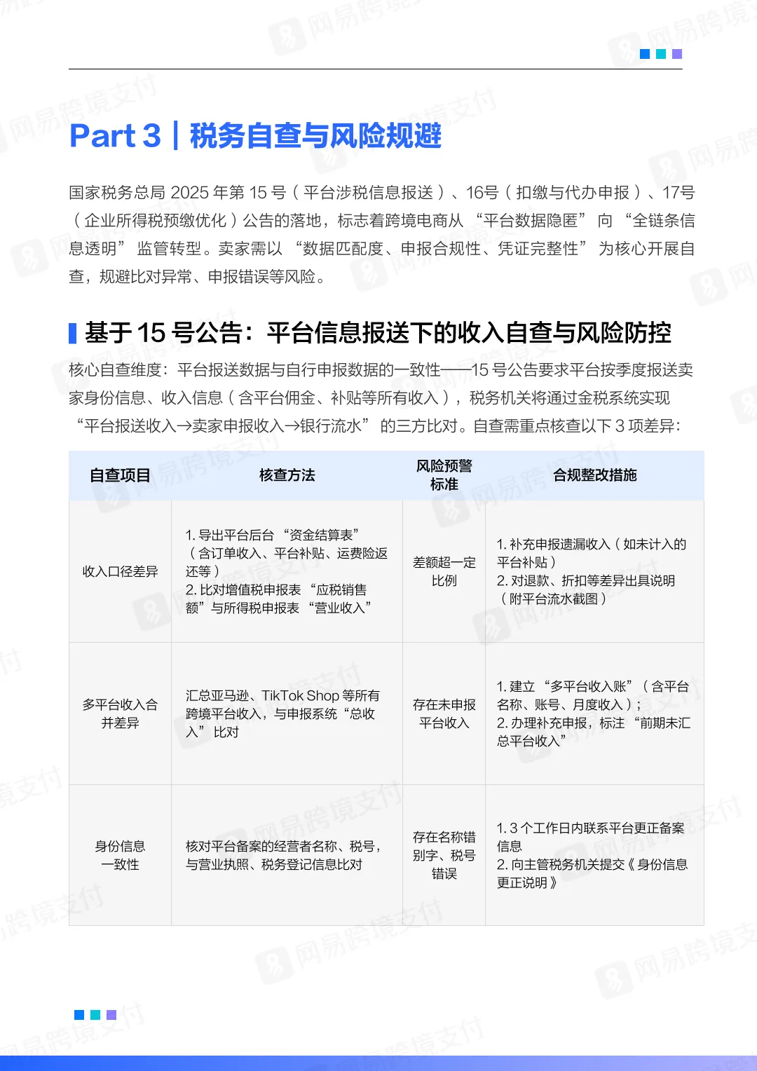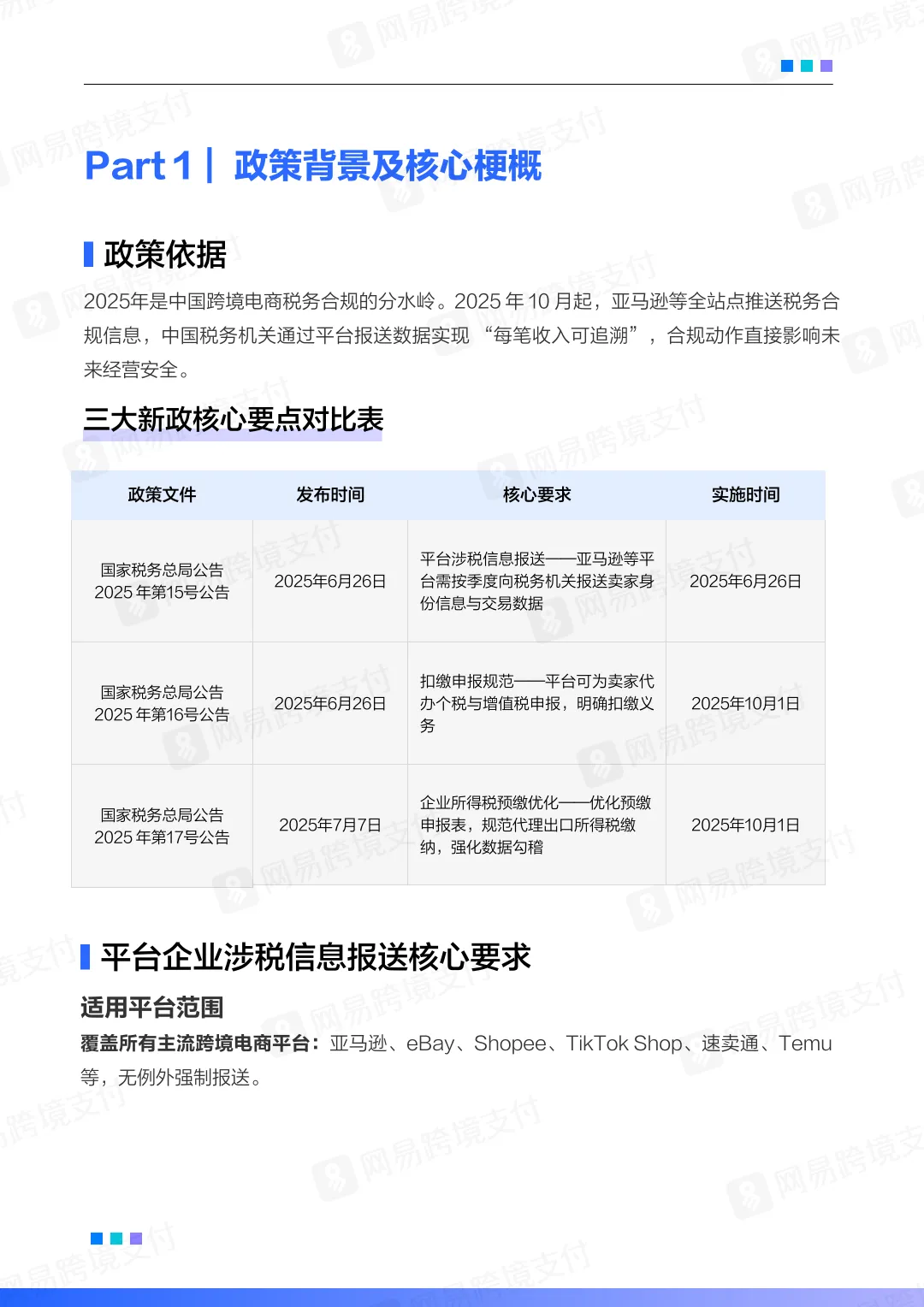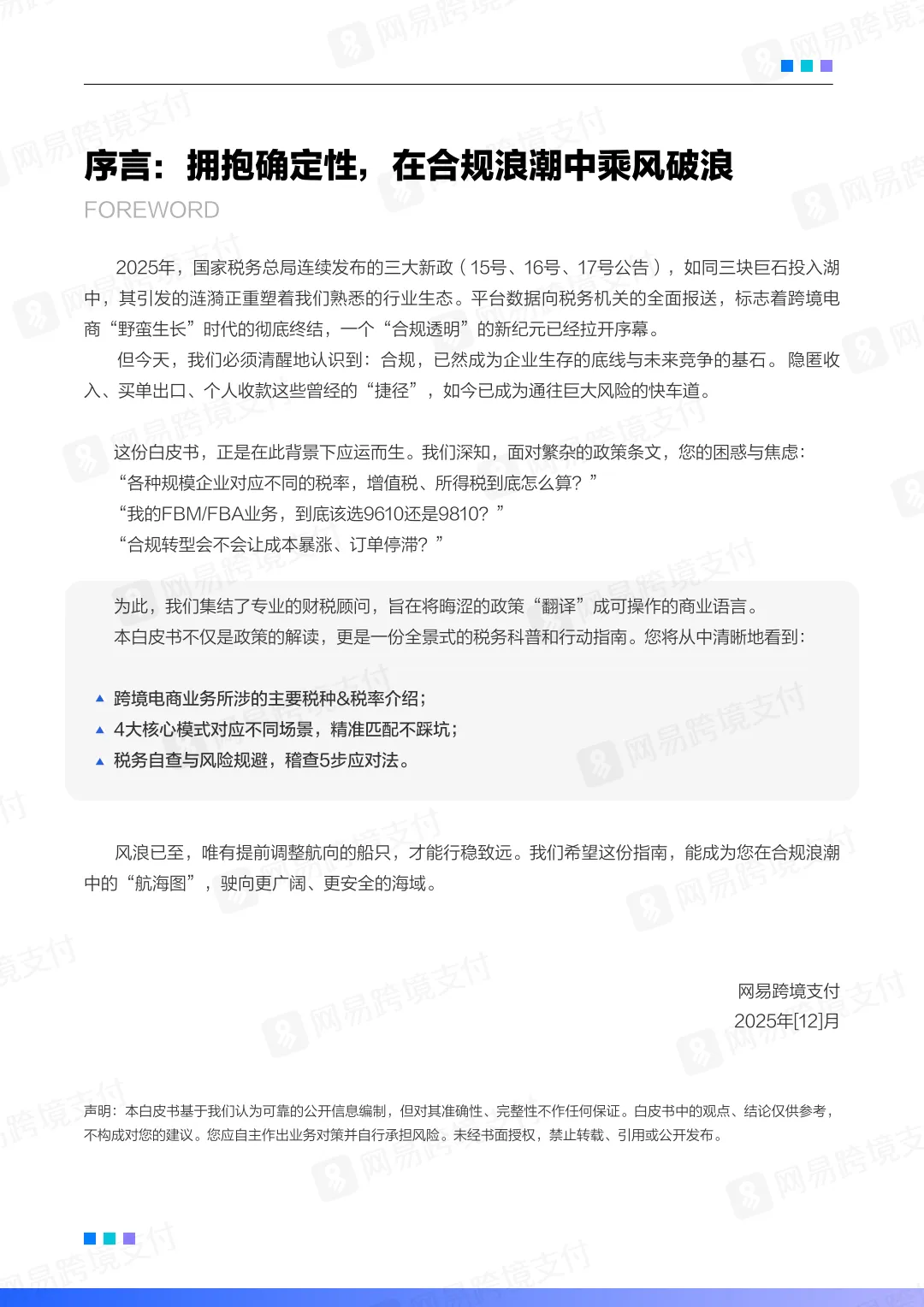 这份《2025-2026跨境电商平台税务合规白皮书》由网易跨境支付编制,旨在为跨境电商企业提供全面的税务合规指引,以应对2025年以来国家税务总局发布的三大新政(15号、16号、17号公告)带来的监管变革。以下是白皮书的核心内容摘要: