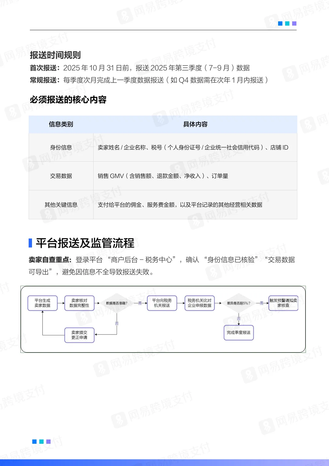 平台数据报送:亚马逊、eBay、TikTok Shop等主流平台必须按季度报送卖家身份、交易数据(GMV、佣金等),实现“每笔收入可追溯”。