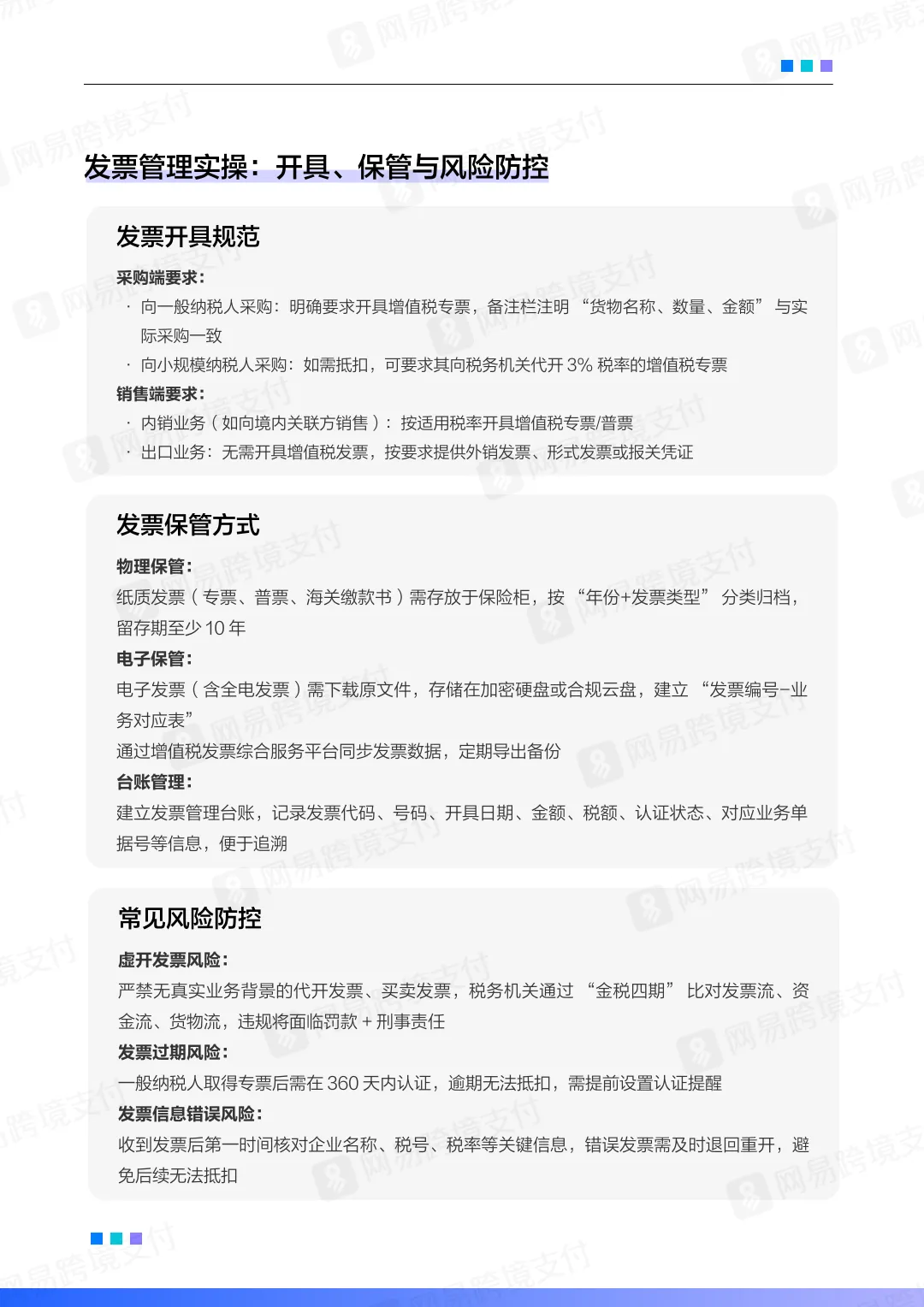 发票管理:确保发票真实、完整、及时认证(专票360天内认证)。