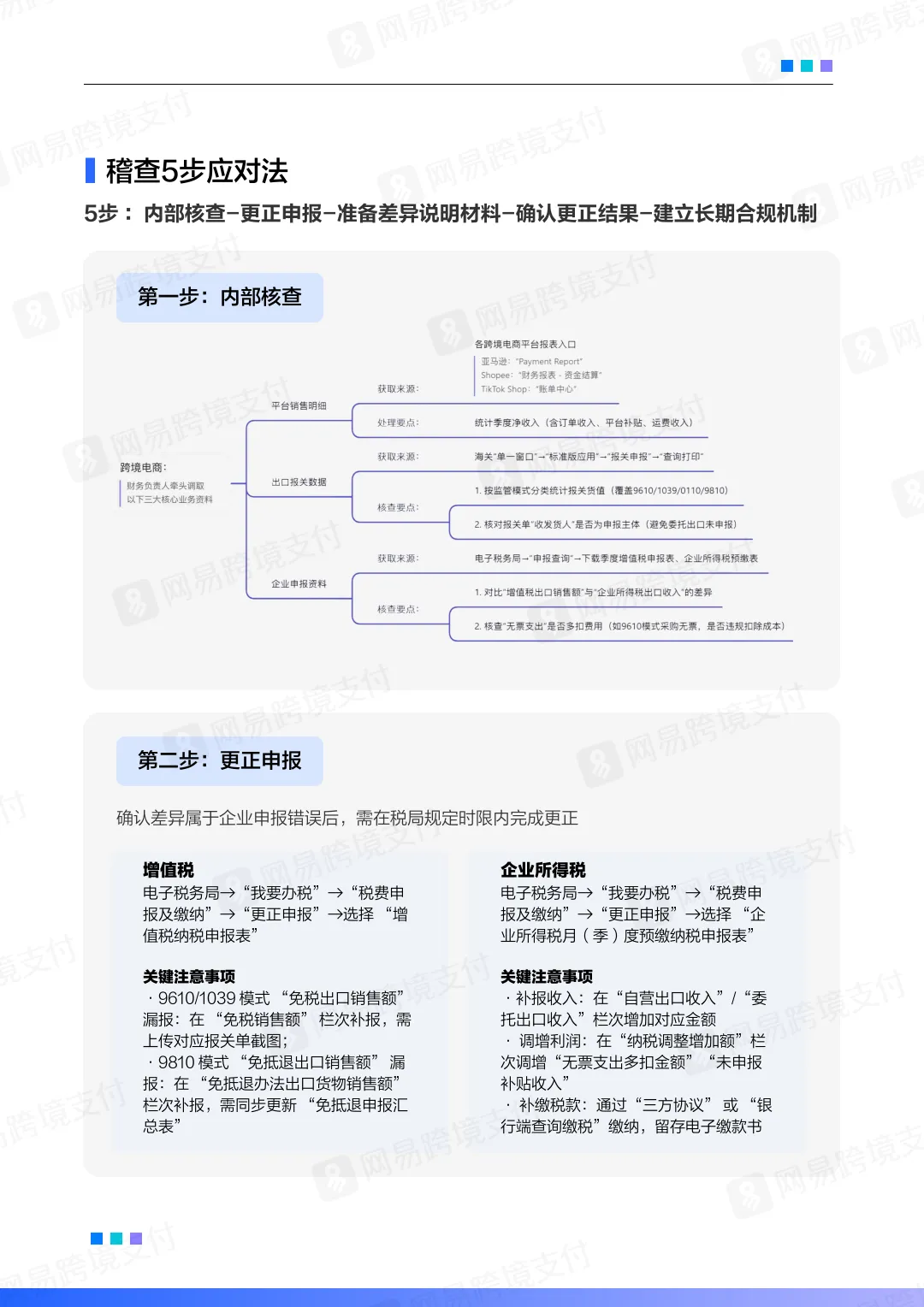 稽查应对:五步法(内部核查→更正申报→准备材料→确认结果→建立长效机制)。