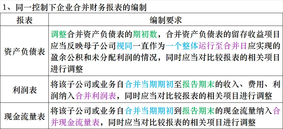 | 调整合并资产负债表的期初数,合并资产负债表的留存收益项目应当反映母子公司视同一直作为一个整体运行至合并日应实现的盈余公积和未分配利润的情况,同时应当对比较报表的相关项目进行调整 |