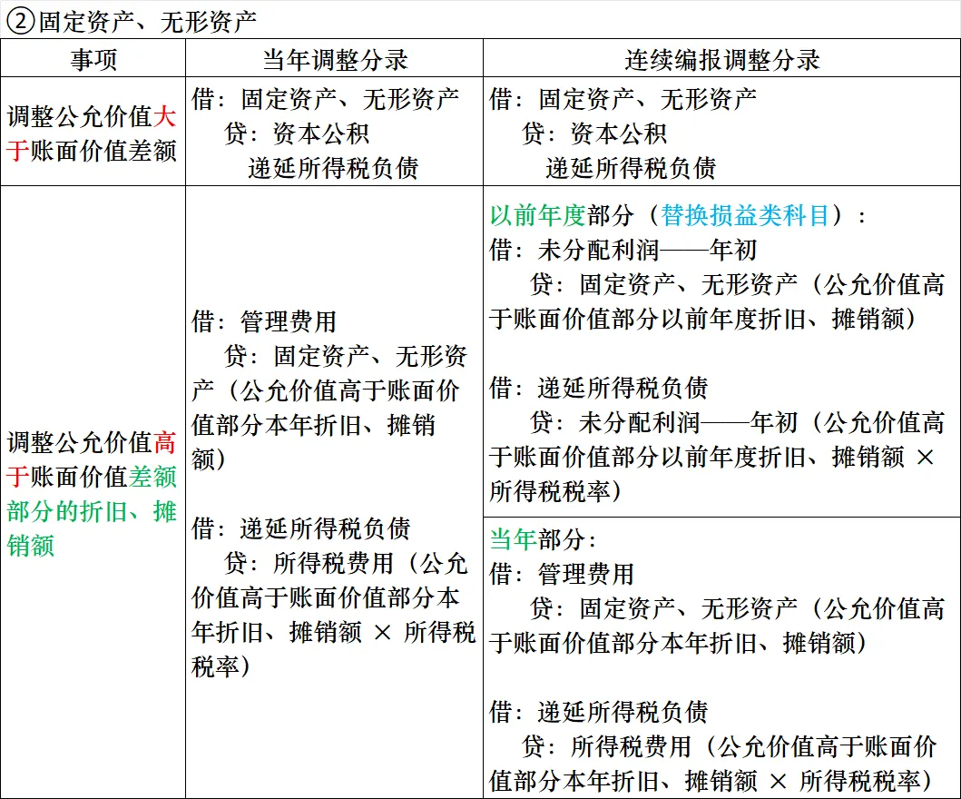 | 当年部分:借:管理费用贷:固定资产、无形资产(公允价值高于账面价值部分本年折旧、摊销额)借:递延所得税负债贷:所得税费用(公允价值高于账面价值部分本年折旧、摊销额 × 所得税税率) |