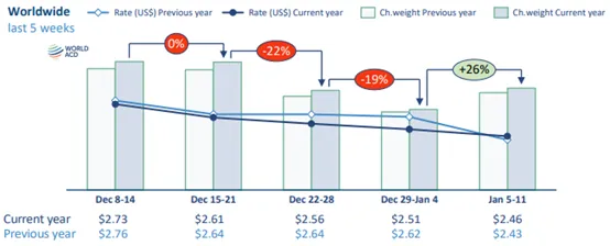 第二周(1月5日至11日)的初步数据显示,一些2025年的总体趋势得到延续。2025年全年货运吨位平均增长4%,而运费平均略低于2024年水平。然而,值得注意的是,2025年开局相对疲软,去年1月和2月的对比24年同期的增幅平均仅为2%,因此,对2026年同比增幅的分析应考虑到这个背景情况。