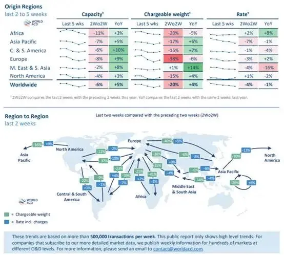 对亚太地区各主要航线的考察也显示,去年的一些模式仍在延续,第二周亚太地区到美国的货运量同比增长 10%,主要得益于东南亚货运量的强劲增长,而从中国和香港到美国的计费重量与25年同期持平。