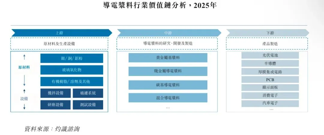 导电浆料行业产业价值链由上游原材料与设备供应、中游浆料配方研发与制造以及下游终端应用三大核心环节构成。上游主要涉及金属粉末、玻璃氧化物、有机树脂等核心材料,以及生产设备的供应;中游作为产业链技术核心,负责基于贵金属、贱金属或碳基等不同导电相体系进行精密配方设计与生产,以平衡导电性、成本结构与工艺兼容性;下游广泛应用于光伏电池、半导体封装、厚膜集成电路、印刷电路板(PCB)、显示面板、消费电子、汽车电子等领域,终端应用对导电率、烧结温度及可靠性的差异化需求,持续驱动着多种材料体系的技术迭代与长期共存。