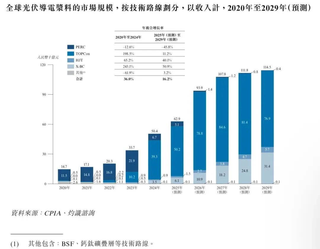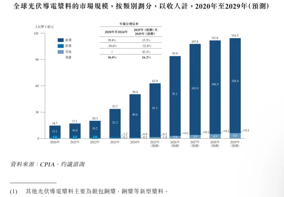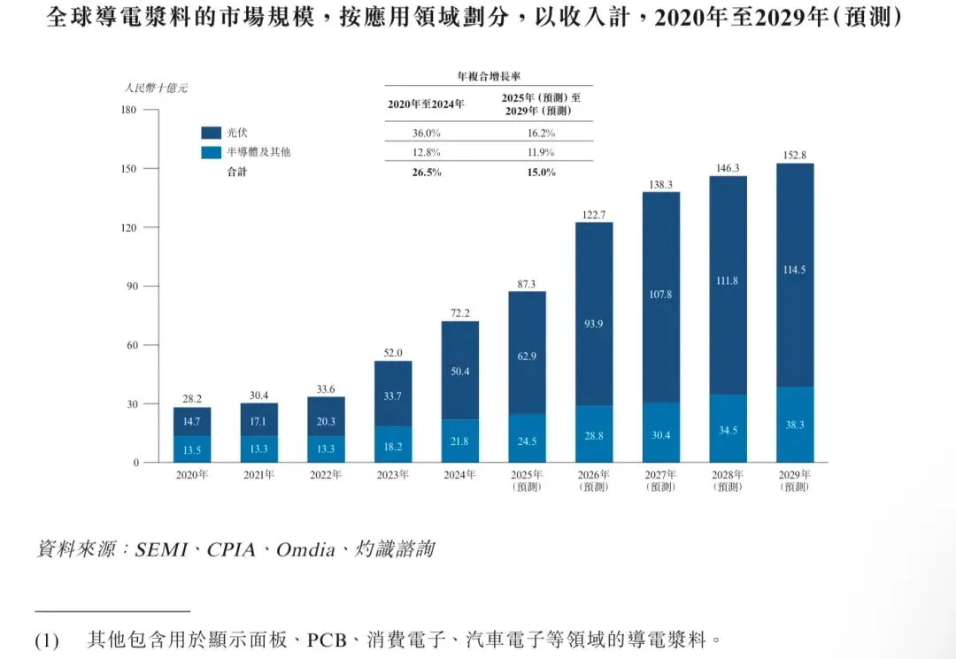 全球导电浆料市场受光伏发展推动下在过去几年发展迅速,由2020年的人民币282亿元增长为2024年的人民币722亿元。其中光伏是导电浆料的最大应用板块,2024年占比达69.8%。随着光伏、半导体等产业进一步扩容,全球导电浆料市场预计将进一步增长至2029年的人民币1,528亿元,2025至2029年间年复合增长率达15.0%。
