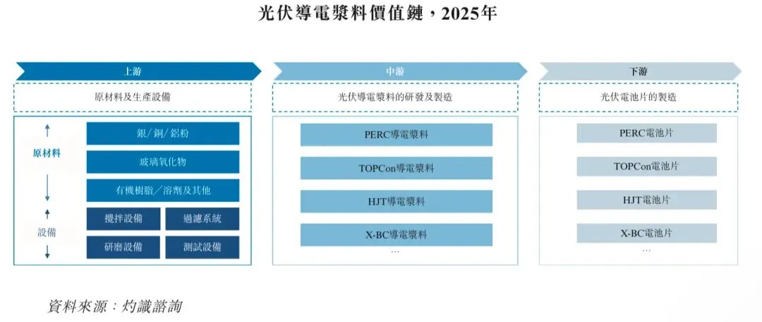 下游主要应用于光伏电池片的生产制造。当前,随着技术加速向TOPCon、HJT、X-BC等N型高效路线迭代,以及激光辅助烧结(LECO)等先进工艺的广泛导入,终端应用对导电浆料的接触机理、烧结窗口及细线印刷性能提出了更为严苛的要求,持续驱动中游浆料企业进行技术创新与产品升级,以匹配下游快速发展的技术需求。