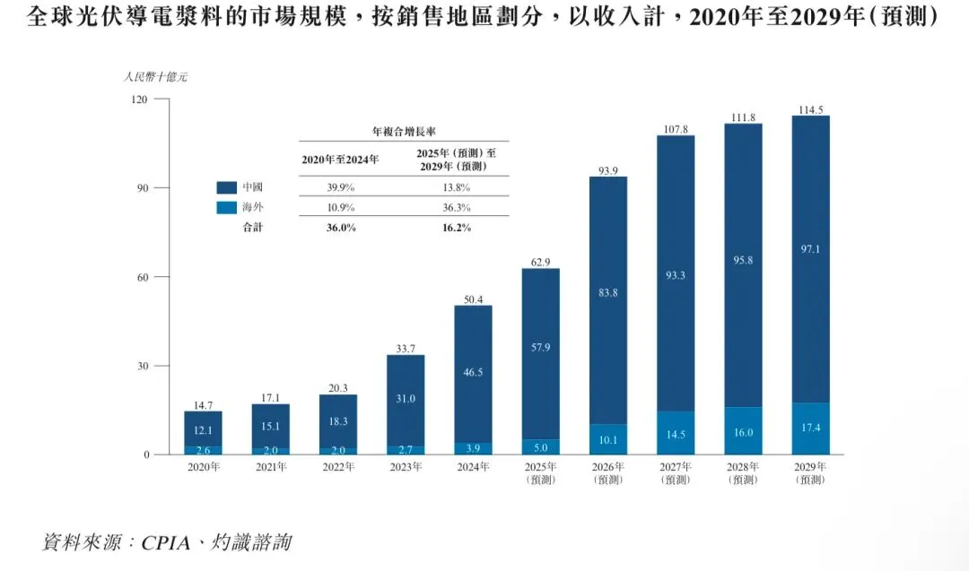 中国是光伏电池片最大的生产地,也是光伏导电浆料的最大销售地。2024年中国地区销售的光伏导电浆料达人民币465亿元,占全球比重达92.3%。未来,随着光伏电池片产线在东南亚、中东、印度等新兴地区的建立,海外光伏导电浆料销量将快速增长,在2024年达到人民币39亿元,并预计将进一步由2025年的人民币50亿元增长至2029年的人民币174亿元,2025年至2029年年复合增长率达36.3%。
