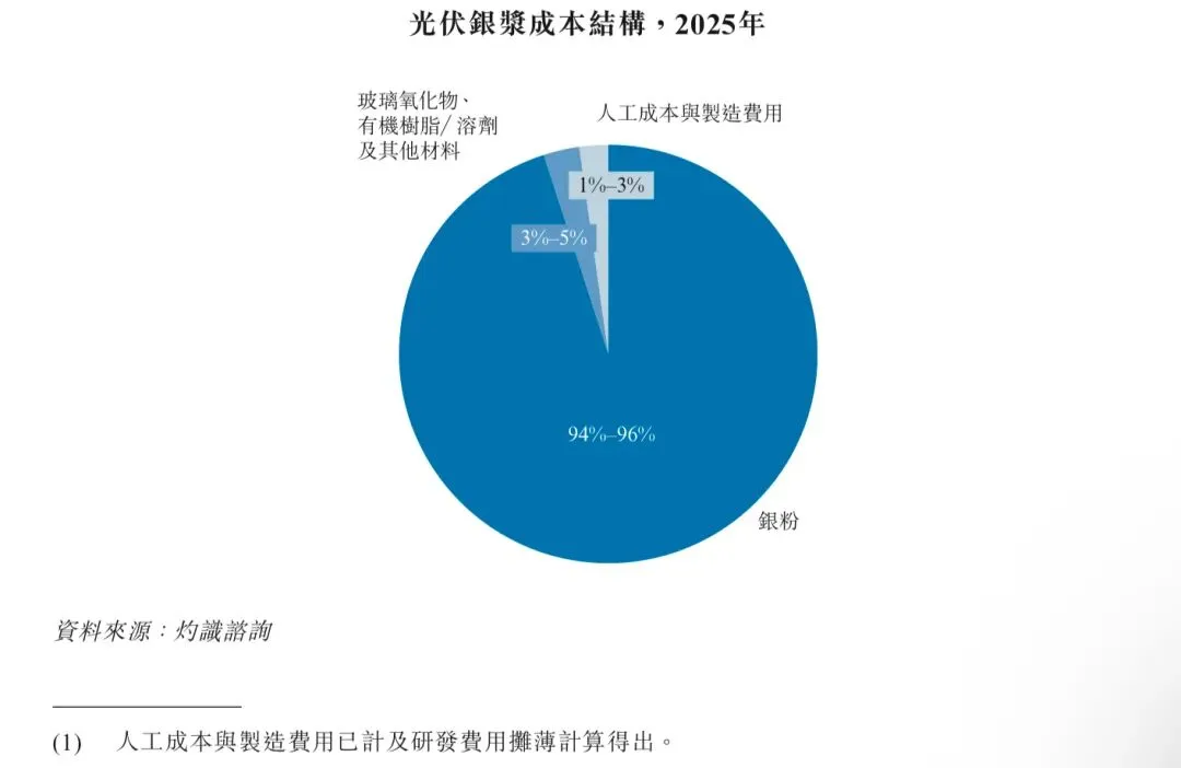 光伏导电浆料目前以光伏银浆为主,2024年占市场98.4%份额。光伏银浆主要由银粉、玻璃氧化物、有机树脂和有机溶剂构成。在光伏银浆成本构成中,直接材料占97%-99%,人工成本与制造费用占1%至3%。直接材料中,银粉作为最为核心的材料其成本占比最大,达到约94%至96%。