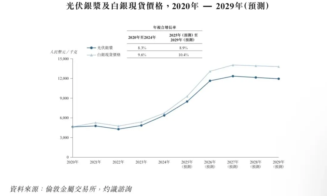 光伏导电浆料定价逻辑一般为金属粉体价格叠加加工费。以光伏银浆为例,其产品定价逻辑通常为白银现货价格加上加工费,加工费因产品类型不同通常在几百至上千元人民币不等。整体来看,光伏银浆的价格变动趋势与国际银价保持一致,2020年光伏银浆的平均价格为人民币4,600元╱千克,并在2024年上涨至人民币6,400元╱千克。