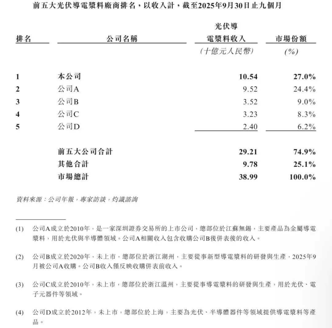 光伏行业在经历过去数年发展已形成较为成熟的产业链,光伏导电浆料行业也在演变中形成出较高的集中度,以收入计,2025年前九个月全球前五大光伏导电浆料厂商占据了约74.9%的市场份额。以收入计,2025年前九个月聚和新材在全球光伏导电浆料厂商中排名第一。