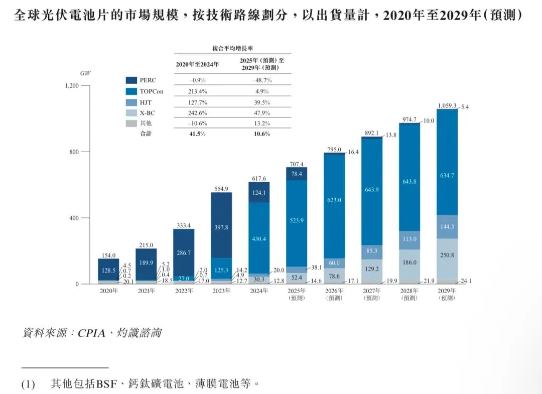 全球光伏电池片的出货量由2020年的154.0GW增长至2024年的617.6GW。中国是全球光伏最重要的市场,2024年,中国光伏电池片的出货量占全球比重达91.2%。随着各国能源转型的深入,全球光伏电池片出货量预计在未来进一步增长至2029年的1,059.3GW,2025年至2029年期间的复合年均增长率达10.6%。从技术路线看,2020年至2022年间,以PERC为代表的P型电池片占据主要市场份额。然而,自2023年起,以TOPCon为代表的N型电池技术逐渐成为市场主流。