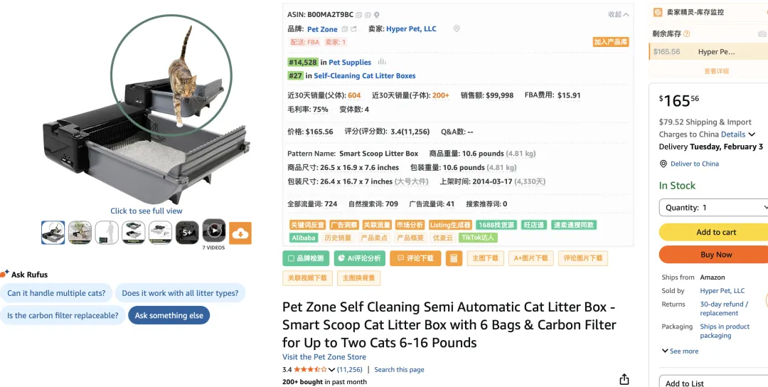 ·平台怎么看:亚马逊算法会认为这是一个非常精准的标题,因为它包含了核心关键词(Self Cleaning,Semi Automatic Cat Litter Box),以及重要的属性(6 Bags,Carbon Filter,Two Cats,6-16Pounds)。这有助于产品在相关搜索结果中获得更好的曝光和匹配度。