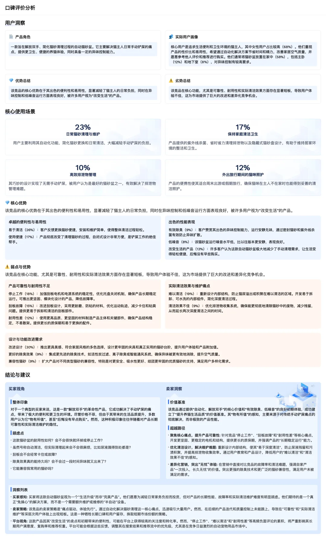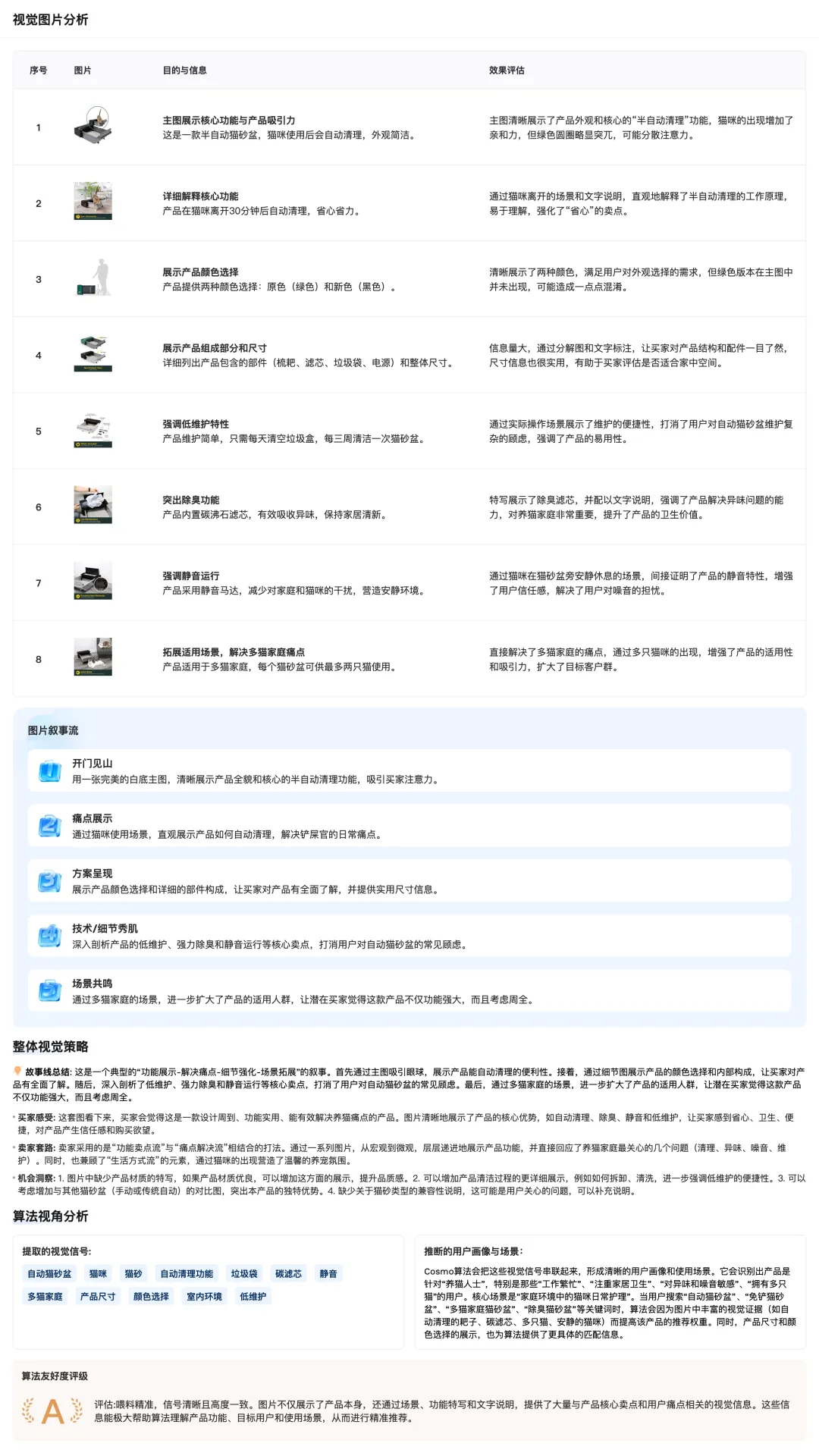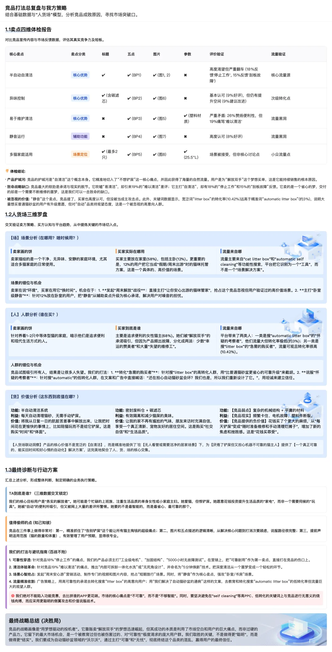 卖家的故事线:卖家想通过这五点,在买家心里建立一个“解放双手、保持家庭整洁、提升养猫幸福感”的智能家居产品形象。它不是简单的工具,而是现代养猫家庭的理想解决方案。