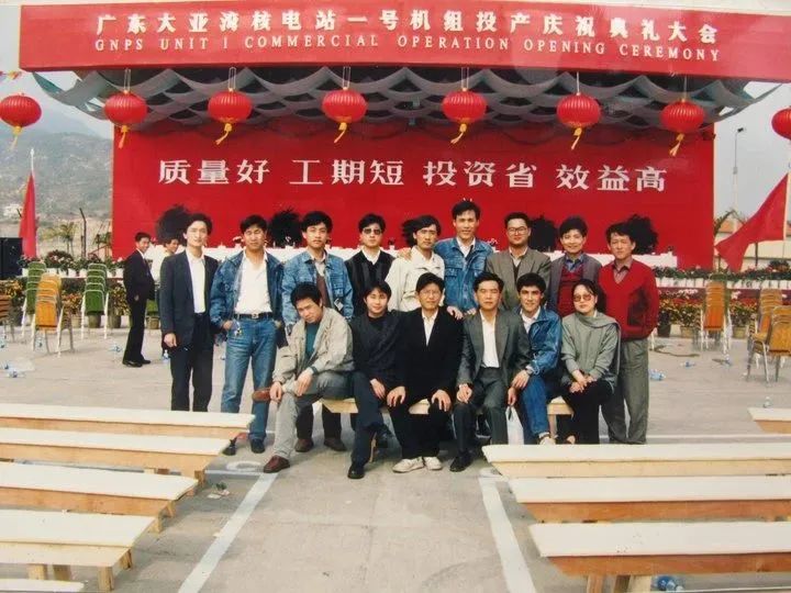 为大亚湾一号机安全顺利投产贡献了自己的一份力量。在庆祝典礼大会上,伍宏和同期同事们激动兴奋地合影,满怀热情地期待着自己和核电的未来。