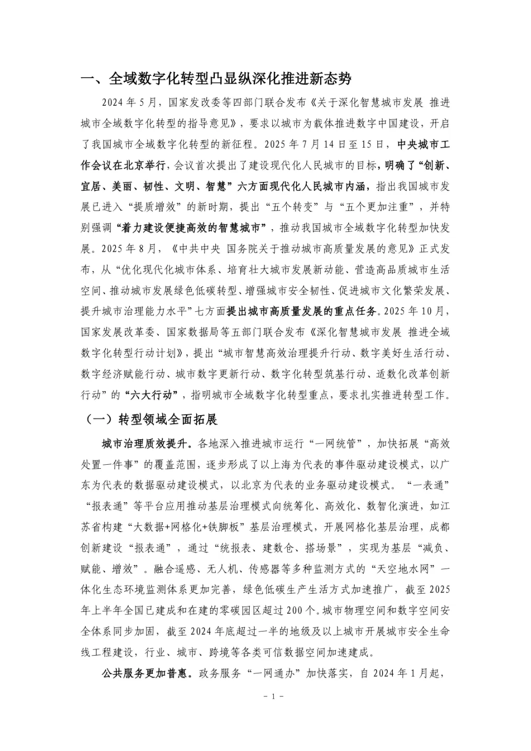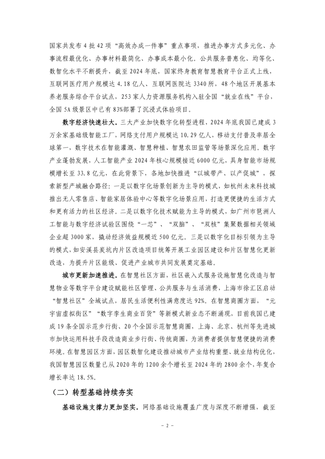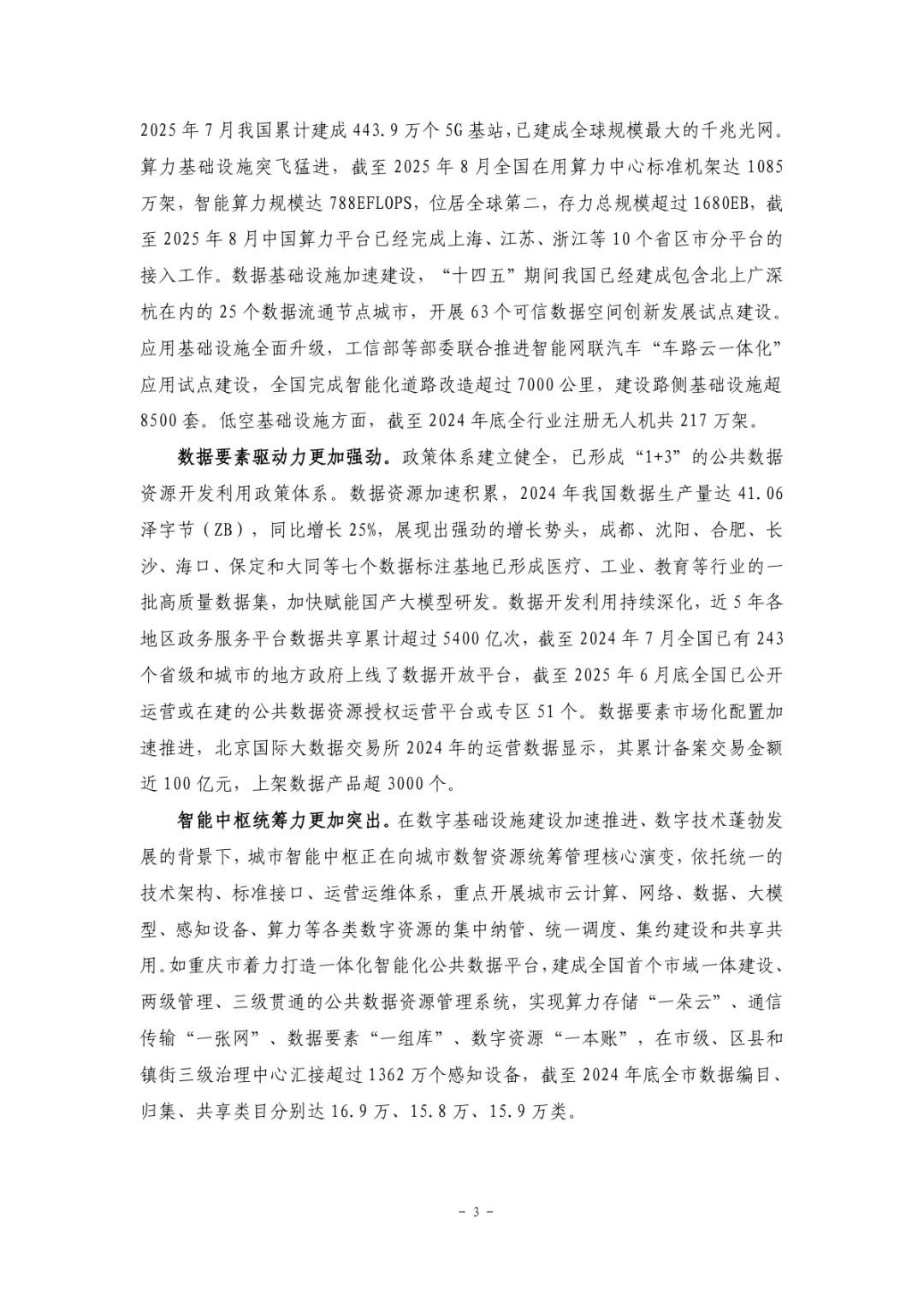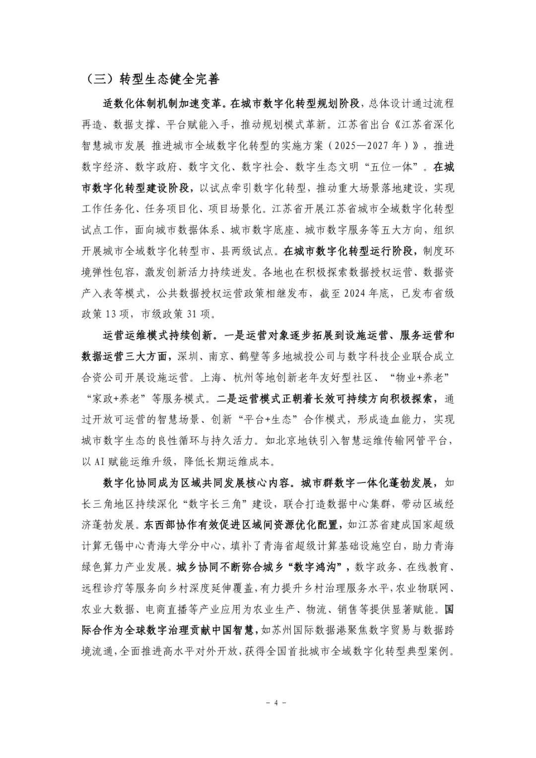 转型领域全面拓展:城市治理“一网统管”、公共服务“一网通办”持续深化,数字经济规模壮大,2024年人工智能核心规模近6000亿元,智慧园区数量达2800余个,年复合增长率18.5%。 基础支撑持续夯实:截至2025年7月,全国累计建成443.9万个5G基站,智能算力规模达788EFLOPS,数据生产量达41.06ZB,25个数据流通节点城市与63个可信数据空间试点落地。 生态体系不断完善:适数化体制机制变革加速,运营运维模式创新,城市群数字一体化与城乡协同深化,公共数据授权运营政策已发布省级13项、市级31项。