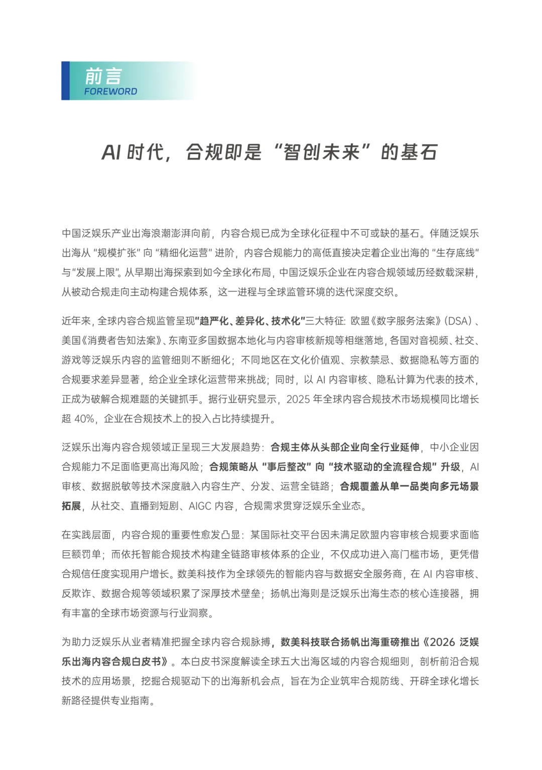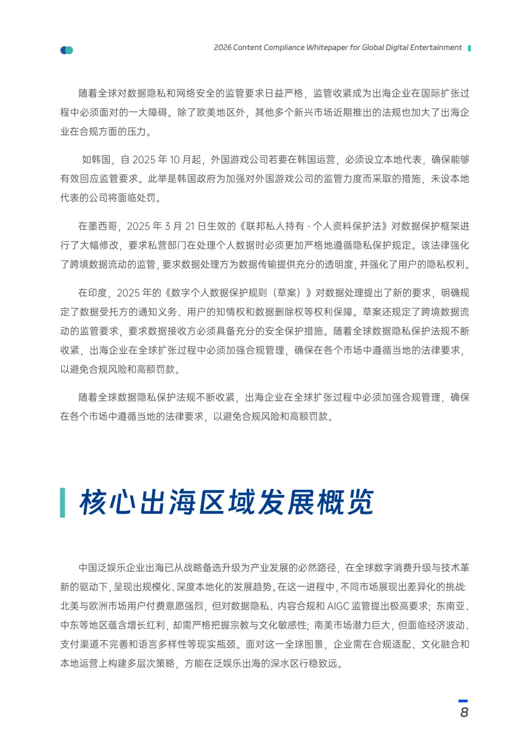 泛娱乐行业在全球化进程中面临日益复杂的合规挑战。随着出海战略从规模扩张转向精细化运营,内容合规已成为企业生存与发展的关键因素。各国监管政策不断收紧,呈现出趋严化、差异化和技术化的趋势。欧盟《数字服务法案》、美国《消费者告知法案》以及东南亚多国的数据本地化和内容审核新规相继出台,对音视频、社交、游戏等泛娱乐内容提出更严格的监管要求。不同地区的文化价值观、宗教禁忌和数据隐私标准存在显著差异,给企业的全球化运营带来诸多挑战。同时,AI内容审核、隐私计算等技术正成为应对合规难题的重要工具。2025年全球内容合规技术市场规模预计增长超40%,企业对合规技术的投入持续增加。合规主体正从头部企业向全行业扩展,中小企业因合规能力不足而面临更高风险。合规策略也从“事后整改”逐步升级为“技术驱动的全流程合规”,AI审核、数据脱敏等技术被深度嵌入内容生产、分发和运营的各个环节。合规覆盖范围从单一品类拓展至多元场景,涵盖社交、直播、短剧及AIGC内容等泛娱乐业态。在实际操作中,合规已不仅仅是法律要求,更是企业赢得市场信任、实现用户增长的重要支撑。部分企业因未满足合规要求而遭受高额处罚,而那些构建起智能合规体系的企业则成功进入高门槛市场并获得竞争优势。本白皮书聚焦2026年泛娱乐出海的三大合规焦点,深入分析全球五大主要出海区域的内容合规细则,探讨前沿合规技术的应用场景,并挖掘合规带来的新机遇,为企业提供专业指引,助力其在全球化进程中建立稳固的合规防线。