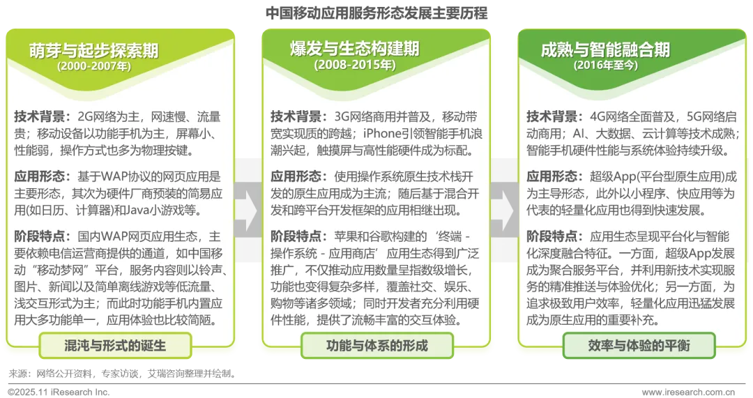 移动应用服务形态发展始于2G时代的萌芽期,彼时以功能简单的WAP网页应用为主;继而进入爆发期,随着3G网络与智能手机的普及,功能复杂、体验丰富的原生应用成为主流;步入成熟期后,在 4G/5G网络与AI等技术的加持下,呈现出“超级App”作为综合体验平台与“小程序”等轻量化应用作为便捷服务入口并存的新格局。移动应用服务形态演进的核心逻辑,始终围绕“如何更高效、更便捷地满足用户需求”展开。未来我们或将看到移动应用形态进一步 “解耦”(即功能拆分、场景化适配),更多元化的应用形态会在不同需求场景下,以最适配、最高效的方式为用户提供服务。