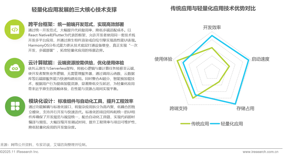 技术进步是轻量化应用发展的底层驱动力。跨平台框架通过统一开发范式提升代码复用率,降低多端适配成本;云计算赋能将资源与算力向云端聚合,优化资源供给与部署流程;模块化设计通过功能解耦与标准化接口,提升开发效率与系统可维护性。三者分别从开发范式、资源供给、工程方法三个不同维度,系统性地解决了轻量化应用在效率、成本和敏捷性上的核心挑战,共同构成轻量化应用快速发展的坚实基础。相较于传统应用,轻量化应用技术在开发效率、启动速度、存储占用上展现出明显优势;虽在极端复杂交互场景略有妥协,但其综合技术优势精准契合存量市场“降本增效”与“快速触达”的核心诉求。