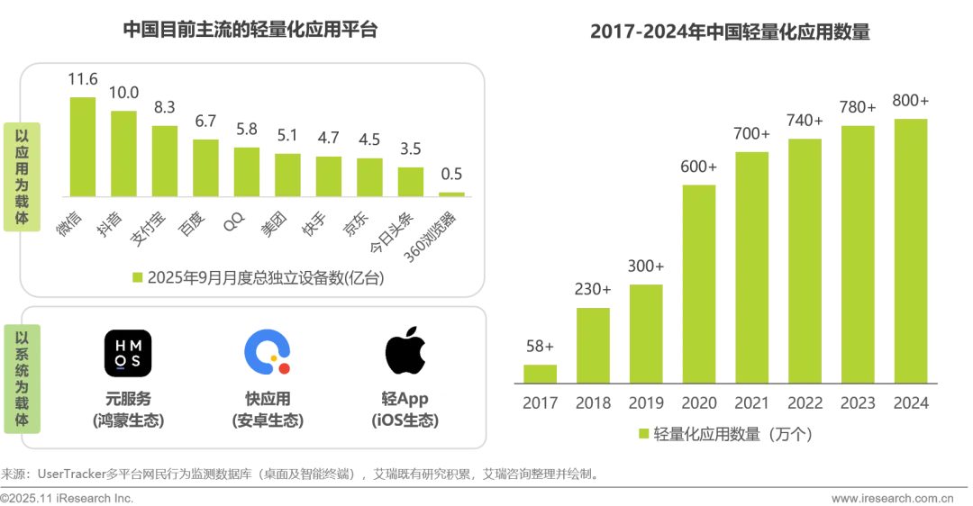 当前移动应用生态正经历轻量化变革,呈现双轨并行、全面开花的态势。一方面,微信、抖音、支付宝等超级应用布局小程序生态,凭借庞大用户基础和社交、支付、内容分发能力,以轻量化形态满足用户 “即用即走” 需求,显著降低了用户的使用门槛和开发者的获客成本。另一方面,操作系统厂商推进轻量化方案,华为鸿蒙生态的“元服务”依托设备互联能力,实现跨端服务随人流转;国内安卓生态的“快应用”通过厂商预装联盟,在安卓终端市场覆盖上卓有成效;iOS生态的“轻App”则以“免下载+扫码直达”模式,降低用户尝试成本。操作系统与超级应用形成“底层支持+场景分发”的双轨驱动,推动轻量化应用在从58万个增长至800万个,应用数量上已远远超过原生应用,成为移动互联网时代用户获取服务的核心入口。