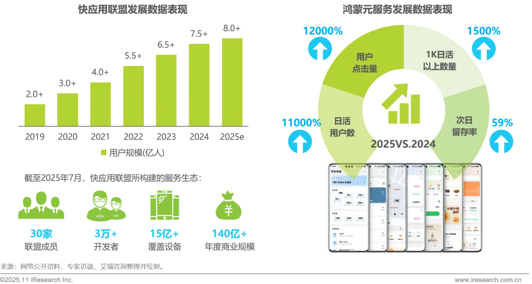 超级应用与操作系统“双轨驱动”的生态效应已在用户端得到充分验证。以快应用为例,其用户规模持续增长,预计2025年将突破8亿,较2019年诞生初期实现超过3倍增长;截至2025年7月,快应用联盟已汇聚30家厂商与超过3万名开发者,覆盖设备超过15亿台,年度商业规模突破140亿元,成功构建了全面繁荣的服务生态。与此同时,鸿蒙元服务也呈现爆发式增长,2025年的日活跃用户数、用户点击量等关键指标相较于2024年同期均有大幅提升,展现出强劲用户粘性与增长活力。这些数据均说明轻量化应用已从技术探索走向大规模普及,用户习惯已经深度养成,其便捷、低成本的优势正持续转化为不可逆的用户选择与坚实的商业价值。
