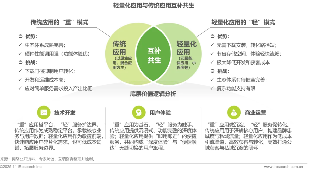 从应用形态来看,传统应用虽具备生态体系成熟、硬件性能调用充分等优势,但也面临着下载门槛高导致用户转化困难、开发与维护成本高昂等挑战。相比之下,轻量化应用则以其免下载安装、用户转化路径短、节省存储空间等优势见长。需要说明的是,轻量化应用与传统应用并非替代关系,而是开发者在数字时代构建“核心能力深耕”与“多元场景触达”双重优势的战略选择。二者的协同共生,意味着移动应用的竞争也在发生转变,已从单一的应用体验,升级为以用户为中心、整合多形态的 “服务矩阵”的比拼。