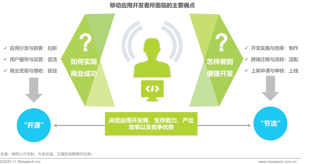 当前移动应用开发者核心痛点集中于商业变现与高效开发两大维度,在创收,亦即“开源”方面,开发者面临获客成本高企、用户活跃度难维系、变现路径不清晰等压力;在降本,亦即“节流”方面,则需应对技术门槛高、多端适配复杂、开发周期长等瓶颈。这两大痛点直接决定了应用产品的生存能力、产出效率与市场竞争力,是影响开发项目成败的关键。同时“开源”与“节流”也是贯穿开发过程的重要考量,影响整体成本与效能,亟需通过生态级解决方案打通从开发投入到商业回报的闭环。