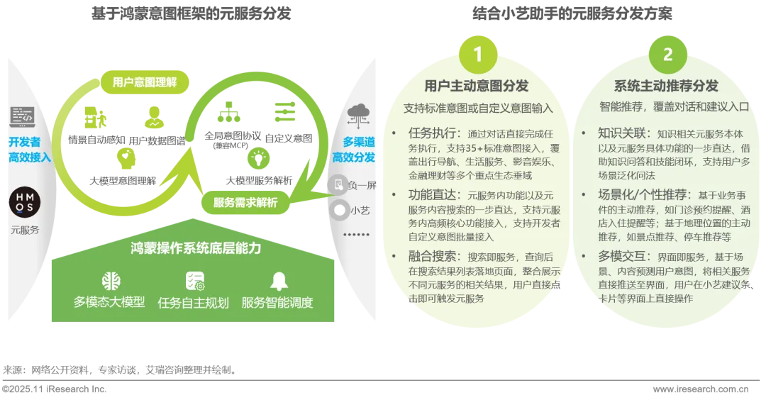 针对传统分发模式被动等待用户请求的局限性,元服务依托鸿蒙意图框架,实现了从“被动检索”到“主动感知推荐”的分发模式变革。该模式基于鸿蒙操作系统底层能力,通过用户意图理解与服务需求解析,借助全局意图协议实现服务功能智能解构,精准捕捉用户潜在需求。结合小艺助手双向交互能力,不仅支持用户通过语音、搜索等主动意图直达服务,还能基于业务事件、地理位置等信息动态自适应推荐,并通过多模态交互打造 “界面即服务” 的沉浸体验。这种高效分发机制让服务具备提前洞察并匹配用户需求的能力,在显著提升转化效率的同时,也为开发者提供了精准主动的用户高效触达新路径。