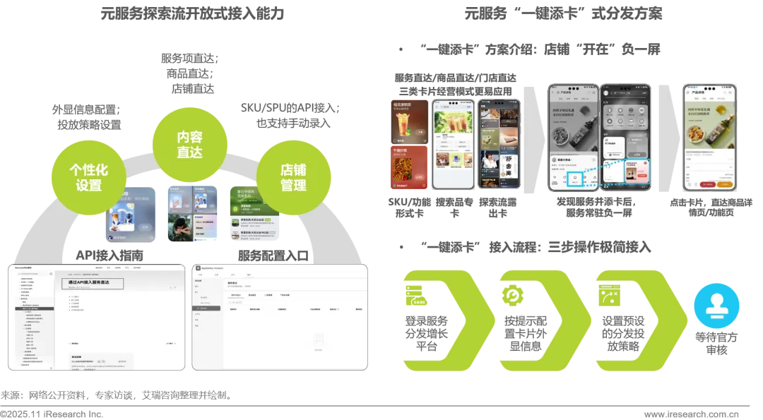 元服务探索流开放式接入,通过完善的API接口与服务后台模版式配置,为开发者提供个性化设置、店铺管理以及核心的内容直达功能,助力开发者高效完成服务卡片的一次接入、多流量场的精准分发。同时搭配元服务“一键添卡” 式分发方案,仅需三步极简操作接入,即可将店铺以卡片形式部署在负一屏,有效提升分发获客效率并支撑获客后的可持续运营。