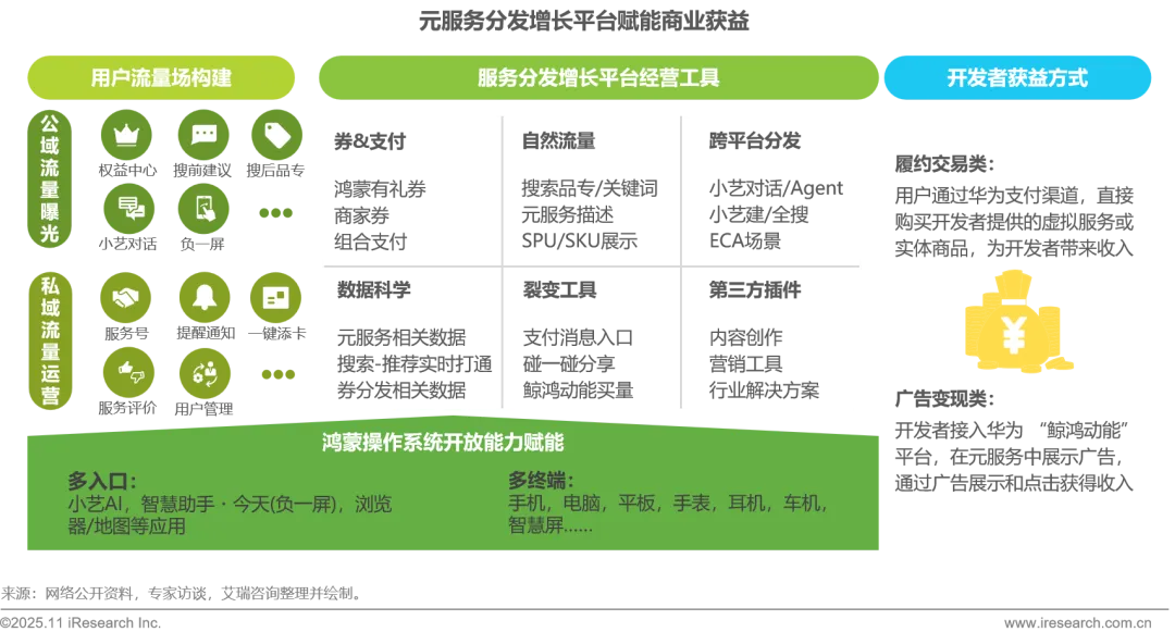 面对中小开发者普遍存在的商业化基础设施薄弱、获客成本高企及变现路径模糊等核心痛点,元服务通过构建系统级公私域联动流量场,配套内置支付、营销及数据分析工具,通过多终端覆盖(手机、车机等)实现履约交易(华为支付直接购买)与广告变现(鲸鸿动能平台)双轨收益模式,系统化解商业化基建缺失、流量获取难等困局,实现从流量触达到收入转化的可持续链路闭环,显著降低商业化门槛,助力开发者聚焦核心服务,驱动商业收益的可持续增长。